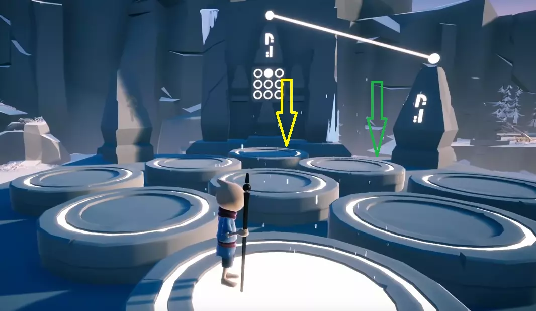 解谜过关规则: 1. 谜题总是从数字7开始,5始终是中心,而需要触碰的数字顺序在每一局游戏或每次出错时都会改变(数字可重复)。 2. 若触碰地面或标记错误,将回到起点,即回到数字7。 标记7之后,在当前情况下会标记出2……需要注意的是,此时地面上的2并非原来的位置,而是要留意照片中亮起的雕像……这时需要从地面上的顶部左侧开始计数……换句话说,数字已发生旋转(当前情况下是向右旋转)。 在当前情况下,新的1是黄色箭头,绿色箭头是数字2,因此这就是需要在地面上踩踏的数字。如果你操作正确,它就会点亮;如果你操作错误,你将重新从初始位置开始。