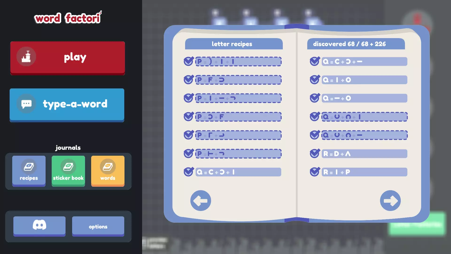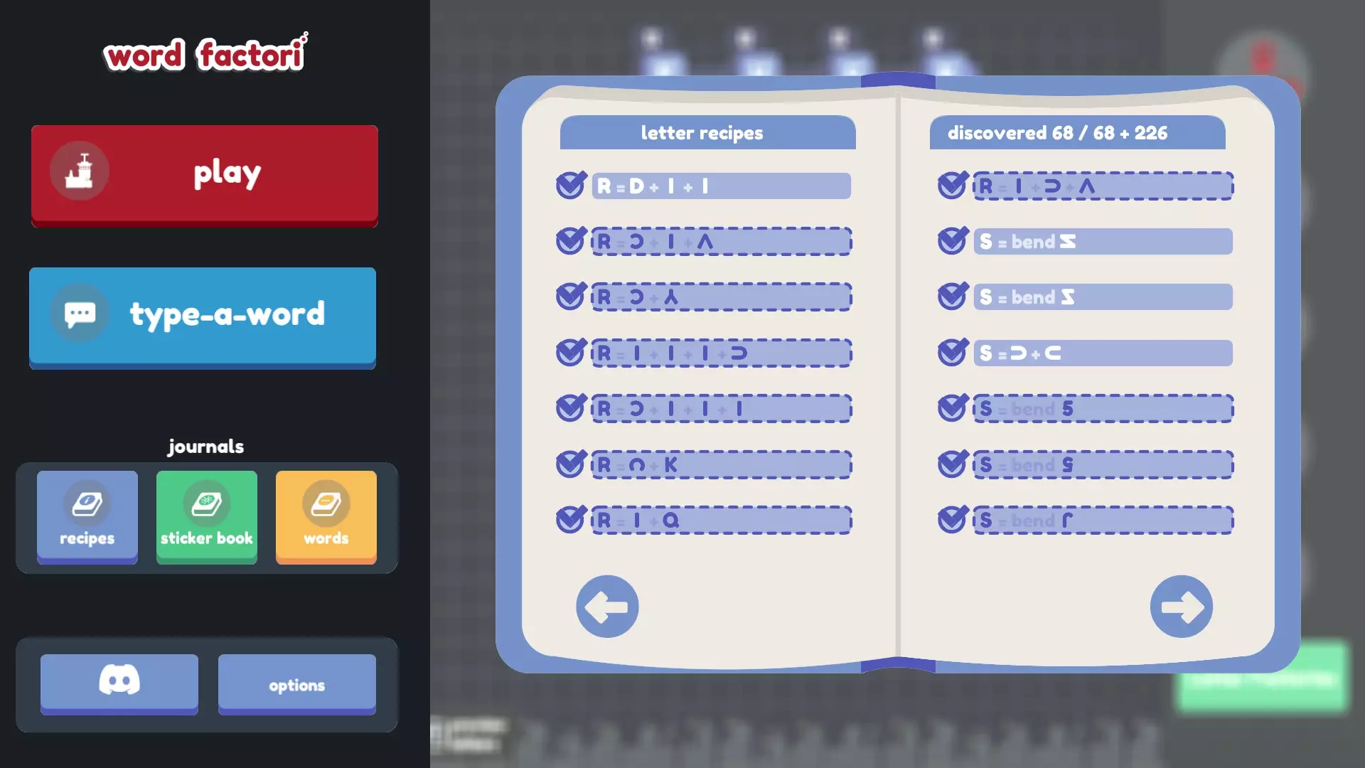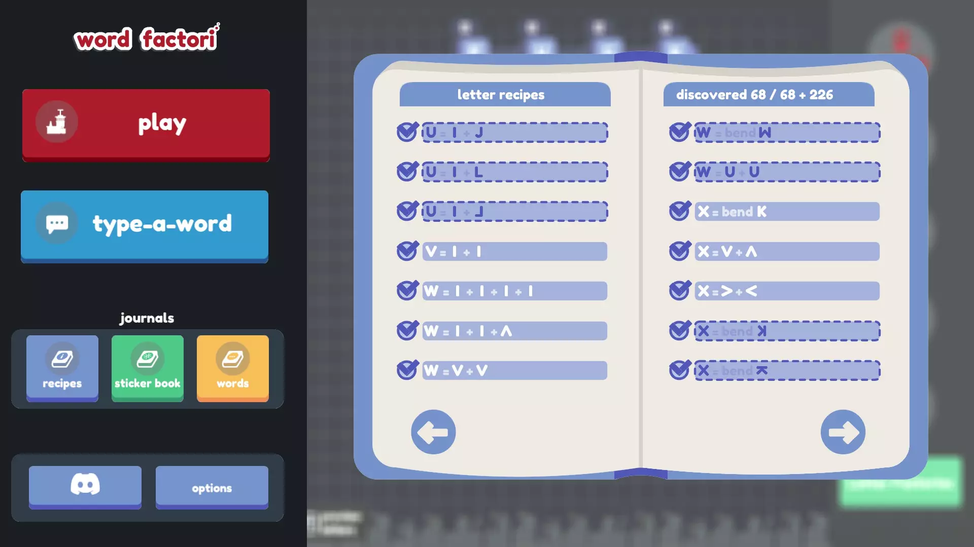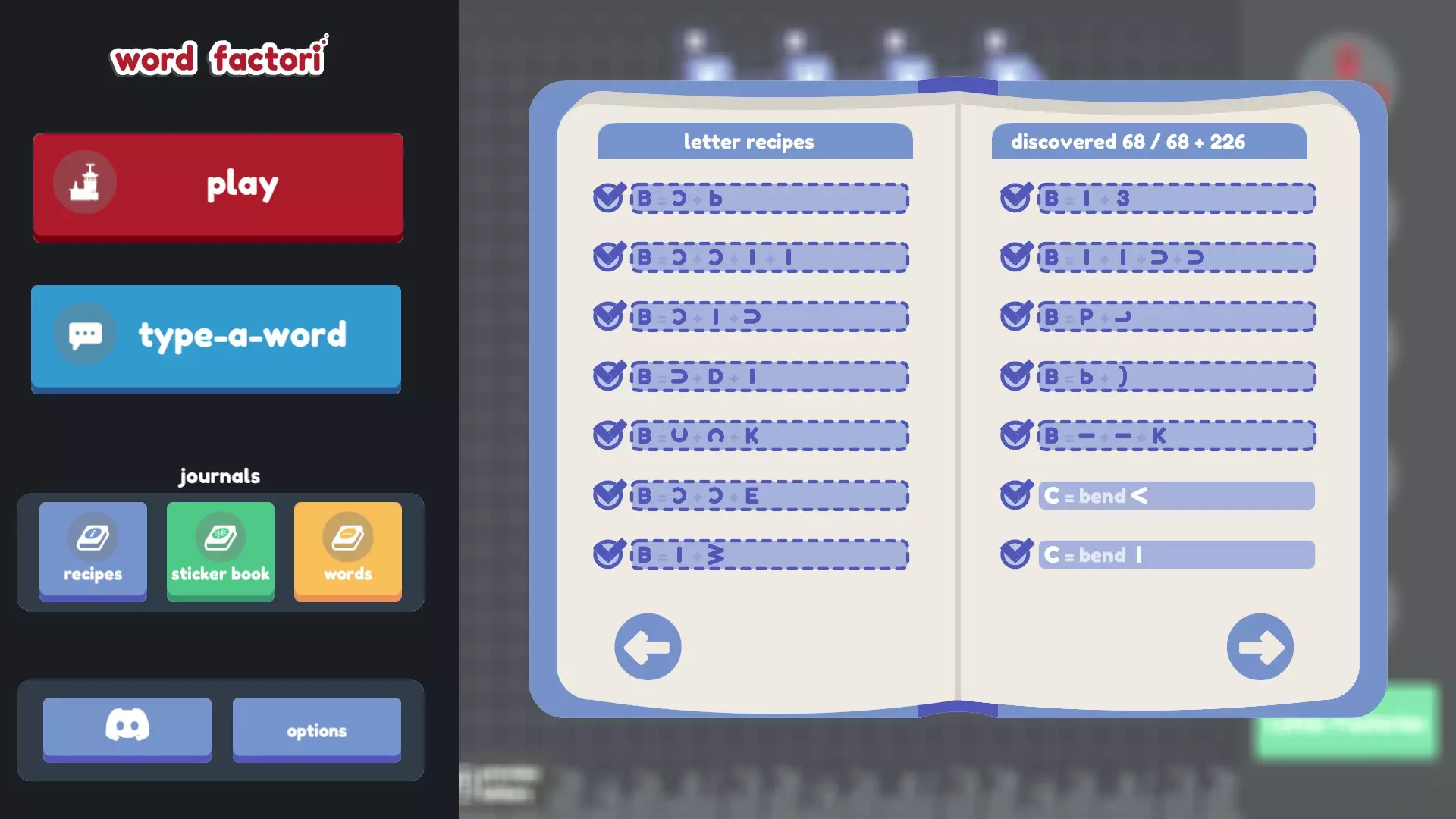谢谢! 如果说三个配方指南还不够糟糕的话…… 不过,其中两个来自旧版本(不幸的是,其中一个缺少大部分截图),另一个则不完整(而且我自己发现的配方太多了,根本无法仅在那里评论我的发现!)。所以我从这三个指南以及它们评论区(还有本指南。非常感谢jovpet1!也感谢ElderAxe在这么久之后还能找到更多配方!)中收集了尽可能多的配方,并结合自己的发现进行了补充! 我尝试了许多不同的组合和排列方式(甚至还尝试了问号,结果徒劳无功),但显然我没有暴力破解所有组合,所以可能还有更多配方有待发现(希望不要再有B或H了)。如果有我遗漏的(来自更新后的游戏,因为之前版本的配方已经更改),请告诉我。 最终目标: 找到所有配方(我们可能已经完成了?感谢Wrothmonk的检查!) 思考字母B 和开发者争论v+^+-应该等于*,弯曲问号应该得到感叹号,以及如果I+)+)组合成B是合理的,那为什么I+I+)+)(就像翻转的C和侧放的U那样组合)不行,为什么4和I的其他朝向组合也不能得到H,还有旋转、翻转和弯曲G完全可以变成@或Q,以及为什么侧翻弯曲的S会变成~,而侧翻弯曲的~却变不成S 多喝几碗鸡肉 noodle 汤 给最终目标列表添加更多内容。希望是鸡汤面的形式。或许是字母汤?