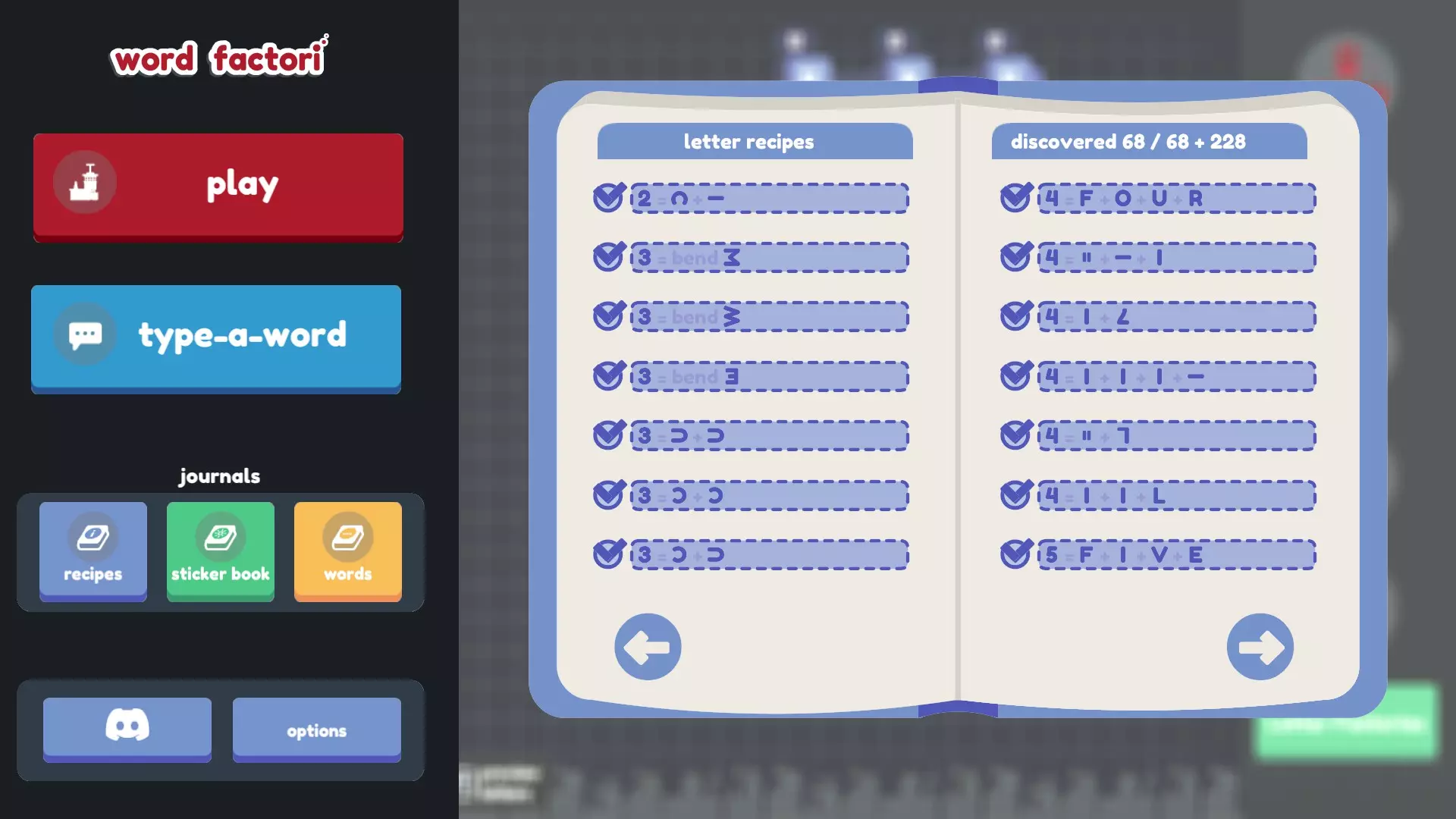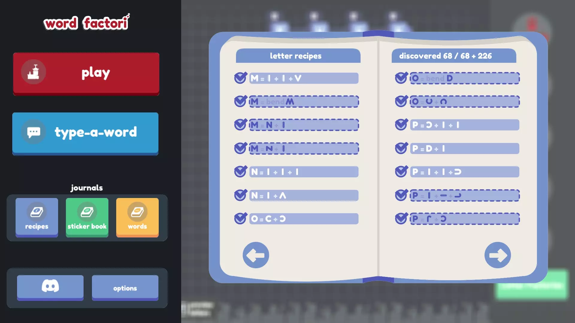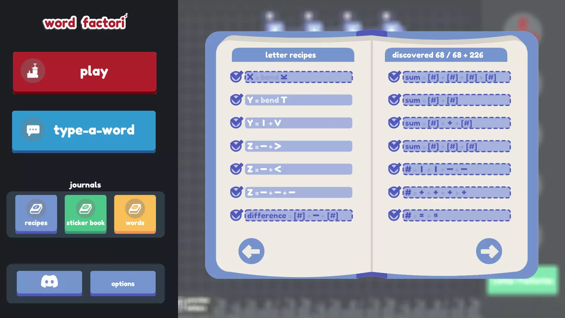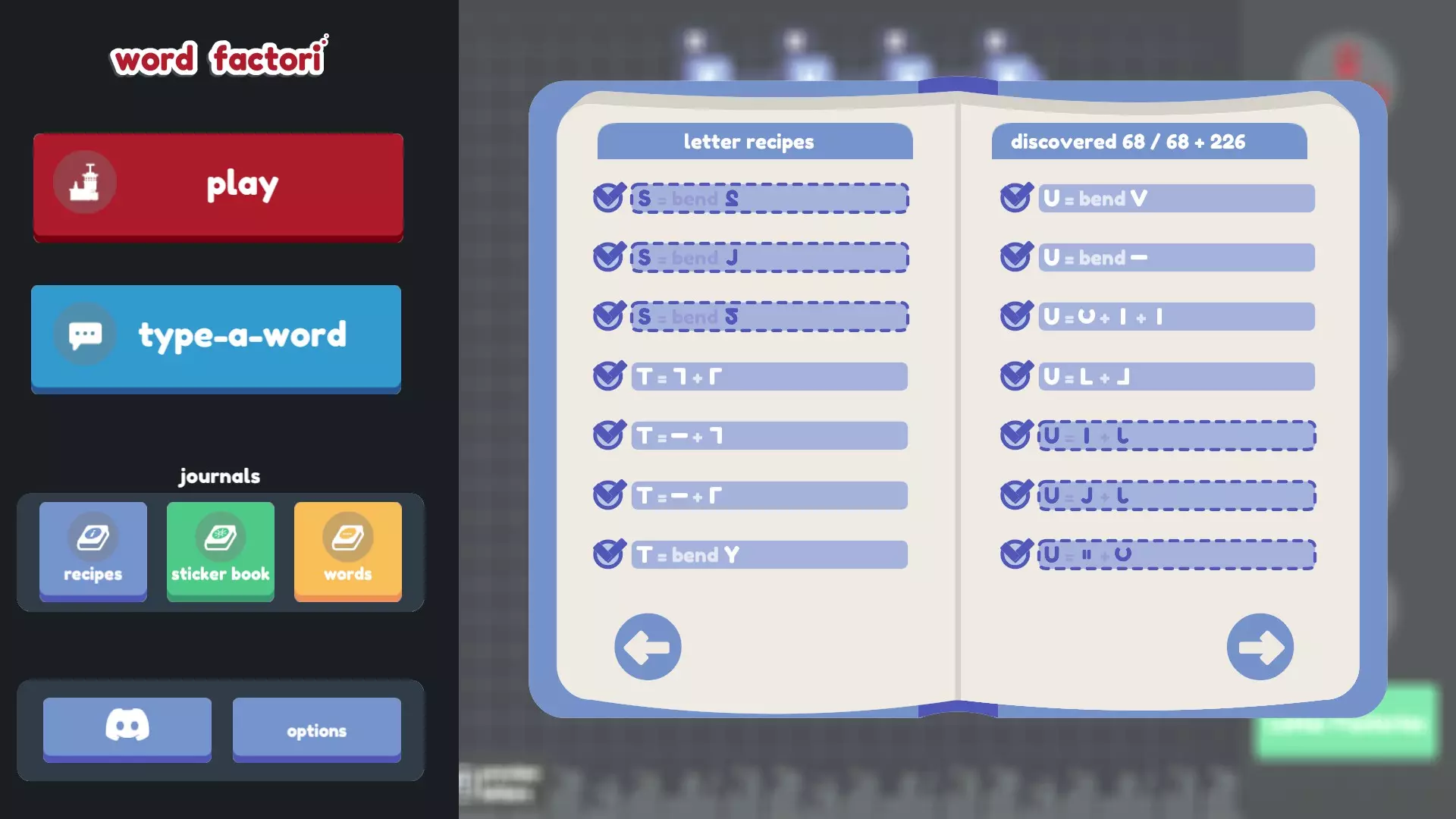 谢谢! 如果说三个配方指南还不够糟糕的话…… 不过,其中两个来自旧版本(不幸的是,其中一个缺少大部分截图),另一个则不完整(而且我自己发现的配方太多了,根本无法仅在那里评论我的发现!)。所以我从这三个指南以及它们评论区(还有本指南。非常感谢jovpet1!也感谢ElderAxe在这么久之后还能找到更多配方!)中收集了尽可能多的配方,并结合自己的发现进行了补充! 我尝试了许多不同的组合和排列方式(甚至还尝试了问号,结果徒劳无功),但显然我没有暴力破解所有组合,所以可能还有更多配方有待发现(希望不要再有B或H了)。如果有我遗漏的(来自更新后的游戏,因为之前版本的配方已经更改),请告诉我。 最终目标: 找到所有配方(我们可能已经完成了?感谢Wrothmonk的检查!) 思考字母B 和开发者争论v+^+-应该等于*,弯曲问号应该得到感叹号,以及如果I+)+)组合成B是合理的,那为什么I+I+)+)(就像翻转的C和侧放的U那样组合)不行,为什么4和I的其他朝向组合也不能得到H,还有旋转、翻转和弯曲G完全可以变成@或Q,以及为什么侧翻弯曲的S会变成~,而侧翻弯曲的~却变不成S 多喝几碗鸡肉 noodle 汤 给最终目标列表添加更多内容。希望是鸡汤面的形式。或许是字母汤?