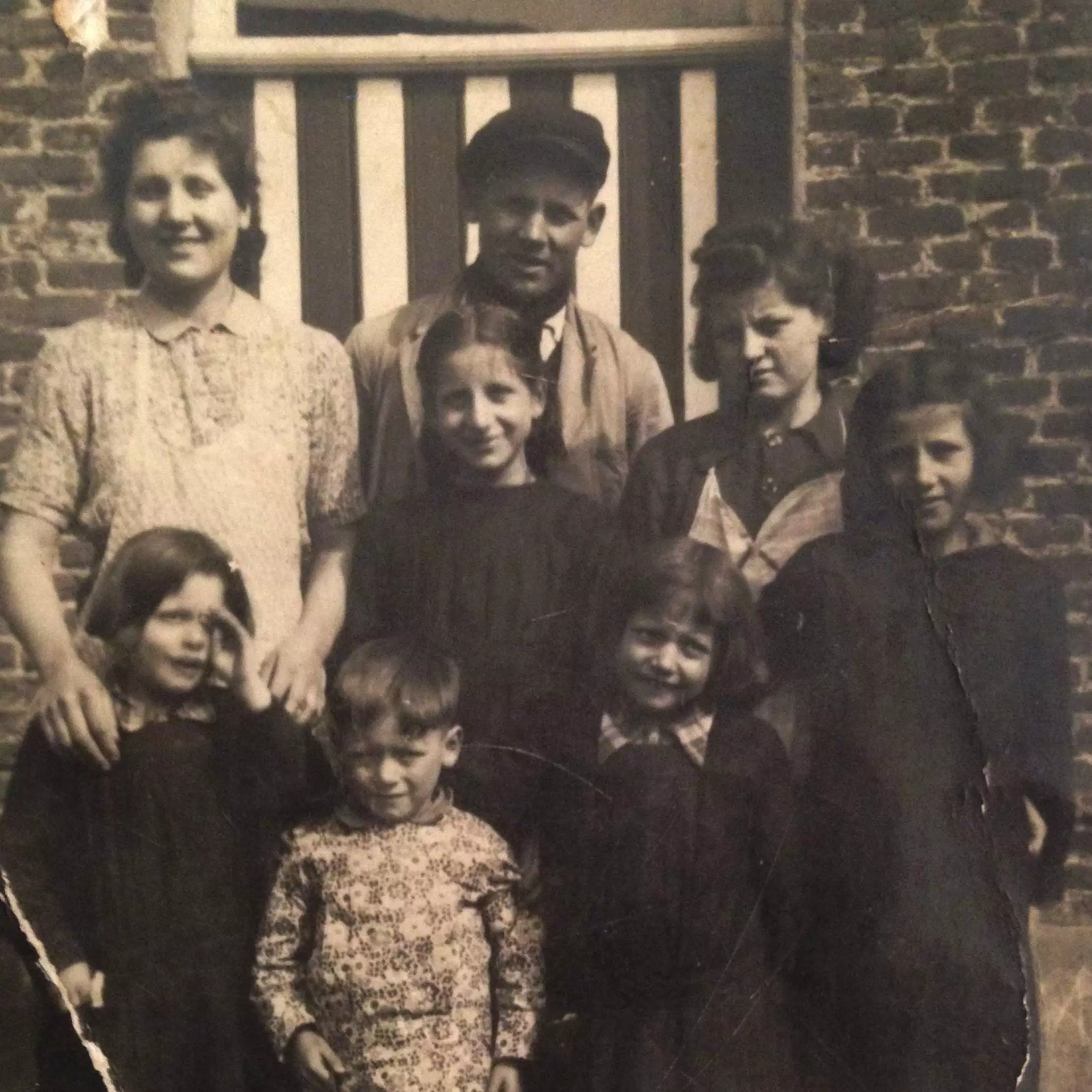 比的兄弟姐妹 长子勒内·韦林登-库伊弗斯最终成为布鲁克尔农舍的最后一位租户,并于1982年弃置了它。 下图中最年长的儿子是勒内,他站在伯莎(左;两姐妹中年纪较大、个子较高的那个)和比(右)之间。他们的弟妹安妮、塞尔、玛莎、玛丽亚和西蒙娜站在他们前面。在背景中,我们可以看到布鲁克尔前门的红白漆。