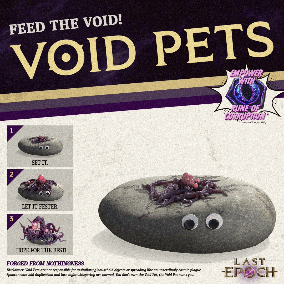 这还不是我们为你准备的全部,还有更多内容!限时期间,可用【腐蚀符文】强化你的虚空宠物。你会用它发现怎样的结果呢?虚空宠物适合摆放在书桌、架子或任何你想展示虚空的地方。它们易于照料,而且让人无法忽视。趁它还没“收养”你,赶紧领养一只吧。