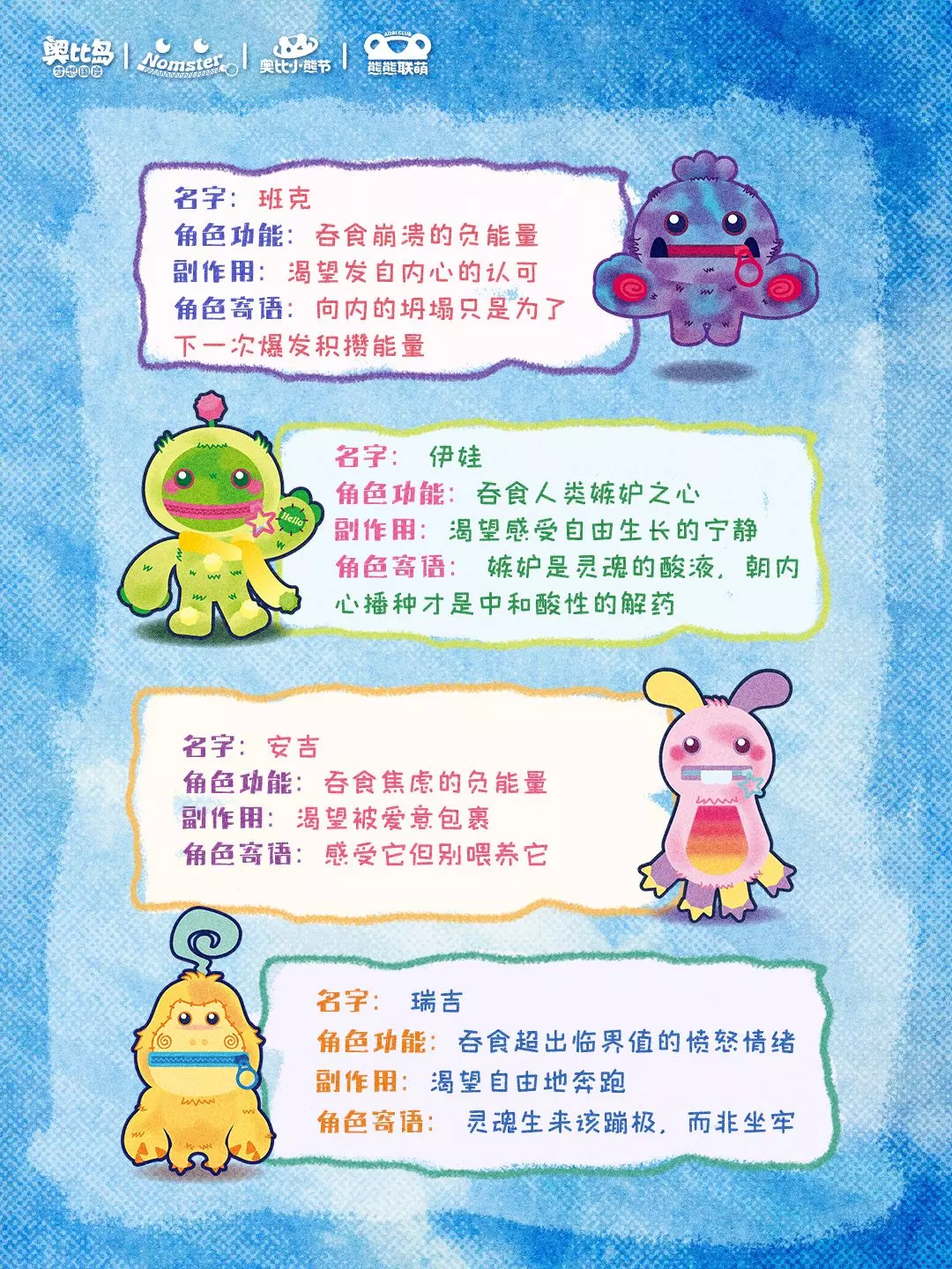 奥比岛的奥比小熊节迎来新朋友Nomster,这些小怪兽是人类情绪的守护者,能吞噬悲伤、孤独等各类负面情绪,还拥有各自的小特质,帮大家赶走坏情绪。