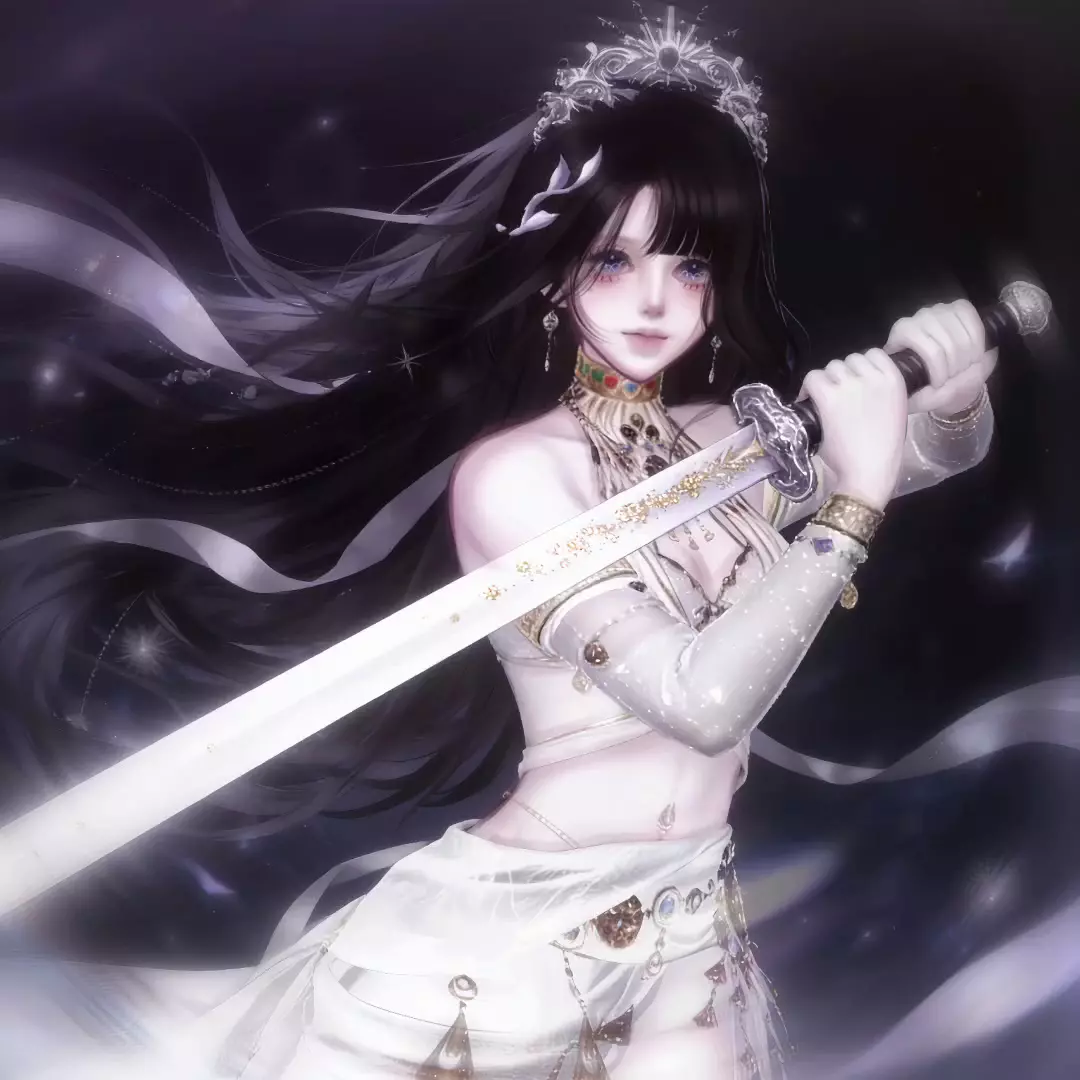 这是一篇夜色精选的社区图文帖,标题为《枯木逢春 静水成玉》,作者分享了手持长剑的冷艳御姐风格插画,画面精致华丽,作者申请精华并@夏七月。