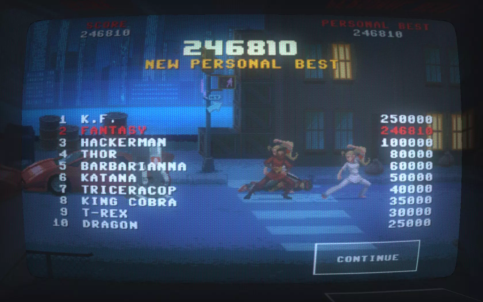 机制 这个游戏的操作非常简单,左右按键向左或右突进并攻击。 以下15点游戏机制: 1. 突进的极限距离大约为两脚之间宽度的1.2倍。 2. 在攻击敌人的瞬间,时间会变慢,但不是停止。 3. 受到攻击的敌人会有硬直,机器人会有击退效果。 4. 突进后没有击中敌人,自身会有一段时间的硬直。(无法操作的时间大概是一个收拳动作) 5. 无法范围攻击,叠加在一起的敌人,只有离你最近的会受到伤害。 6. 主角出现的动作是随机的,除了开枪以外,所有动作都有打击的回馈声。 7. 打机器人和打人的回馈声是不同的。 8.收到攻击或出现MISS时,连杀数会减少四分之一至三分之一,连杀数越高减少越多。 9.所有攻击的伤害相同,主角受到任意3次攻击就会倒下。 10.连杀数越高,单次击杀的得分越高。 11.连杀数是连续击杀数,而非连击数。 12.主角受到敌人攻击后,背后的敌人会强制后退至屏幕边缘,且所有敌人速度变慢。 13.每增加一个连杀数,分数就会翻倍。每达到20倍连杀,敌人速度会提升一个级别。 14.击杀不同的敌人获得的分数不同(详见下文【敌人特性】)。 15.敌人的站位通常就是你的极限突进距离,因此在秒杀一个敌人后,应根据当前敌人的移动速度,调整自己的攻击节奏。 敌人特性 1.防毒纳粹兵(小兵)