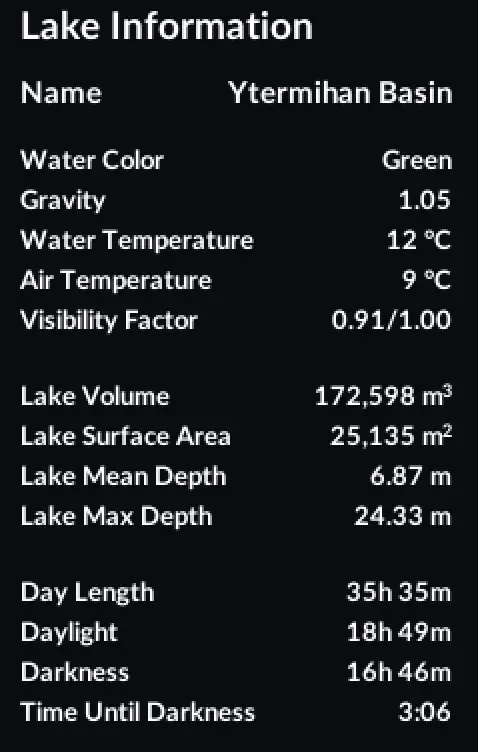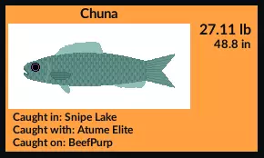 湖记录仍然保持在10.90磅,但我要提醒你小心的那条鱼身上带有一种我不愿去想的黑暗力量印记。你看,这条鱼正好在6.66磅时停止了生长。我倒霉地在翡翠鱼市附近钓到了它,然后你猜怎么着,赌徒加里连续出现了两次,拿走了我的 credits。接下来连续八天,钓到的布拉皮鱼没有一条超过两磅。 这个湖里的风险值得回报,而且正好有借口去格洛丽亚那里,把布拉皮鱼给她。我不相信没有比我已经放进船里更大的瑟鱼了。如果你钓到任何超过19.10磅的鱼,告诉比夫船长。 祝渔运亨通, 船长牛肉 更多信息 你可以在以下渠道找到关于《星际钓鱼》的更多信息: 《星际钓鱼》维基