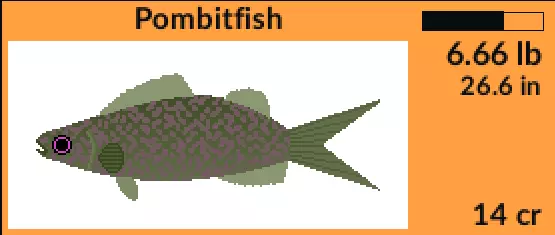 这种深色的“大家伙”有着超过17磅的湖泊纪录,值得你耐心等待。它们喜欢缓慢的饵速,并且停留在水体上层。当大家伙上钩时,你会明显感觉到。我曾见过一条这种鱼整个吞下一条Wrampfish。幸运的是,它们更喜欢比Wrampfish大得多的饵,所以你不会遇到太多误捕。要有条不紊地搜索水域,先进行半距离抛投,然后转移到其他区域。这么说吧,现在这个湖泊纪录是我的个人最佳成绩,也可以成为你的。 如果你开始钓到Blappi,把它们保存起来,然后向东前往格洛丽亚的码头。她正在寻找小型鱼类进行研究,并且需要一堆。确保为这些鱼使用灵敏的鱼竿,凭直觉或轻微的动静就扬竿刺鱼。它们体型虽小,却能让你收获颇丰,格洛丽亚或许也终于会注意到你。要想在它们咬钩时察觉到这些鱼,我会使用完全升级的TFG调查者(TFG Investigator)。如果你没有那么多 credits,就用最轻柔的力道握竿……就像格洛丽亚曾在南海岸,喝了一两杯庞比特鱼(Pombitfish)酒后那样轻柔的触碰。 除了能发酵成令人陶醉的饮品外,庞比特鱼(Pombitfish)也是你网中可能出现的另一种当地“大家伙”。