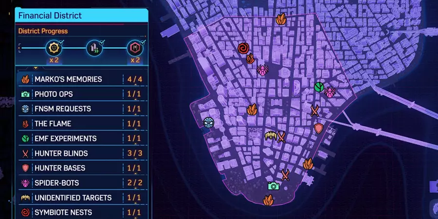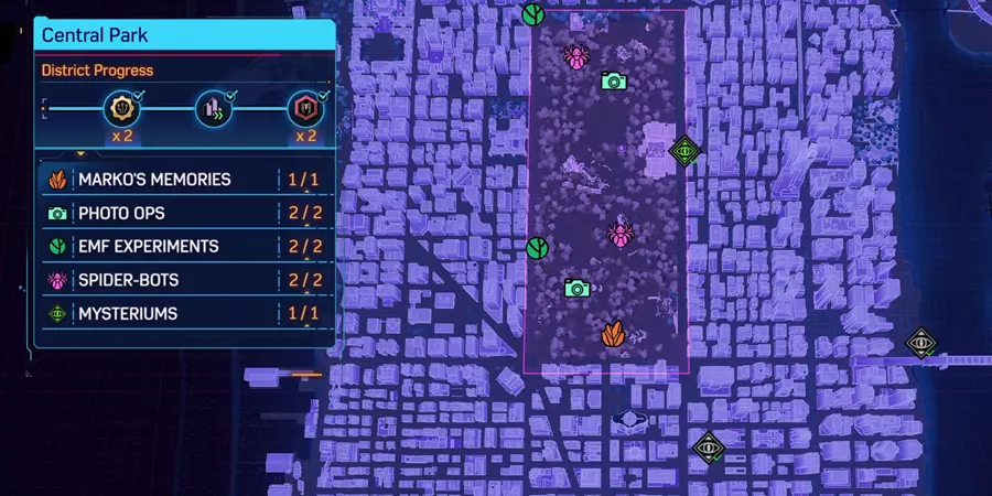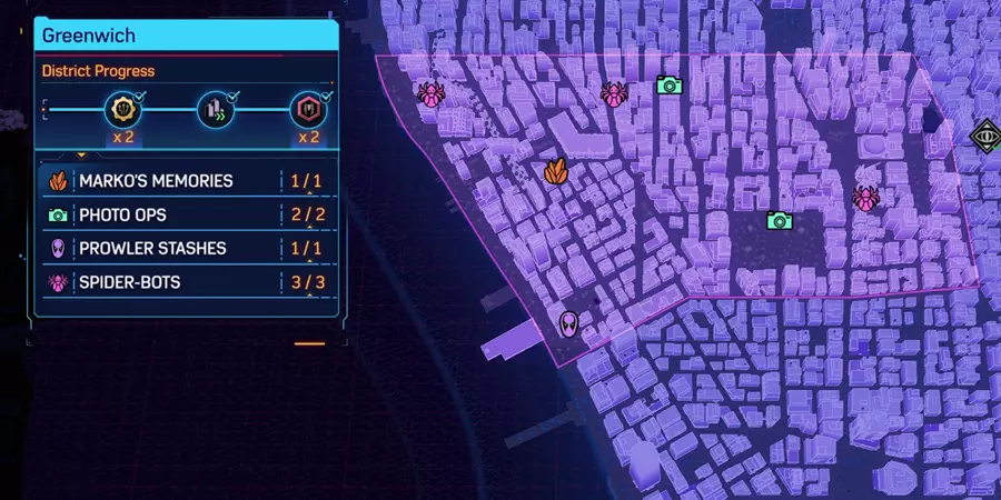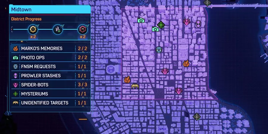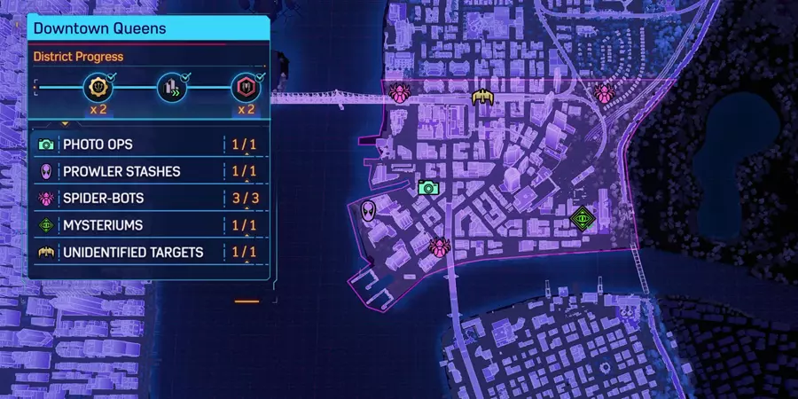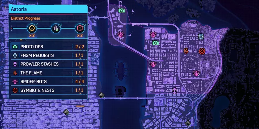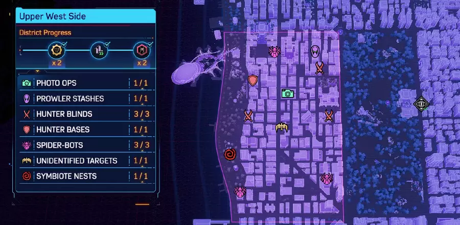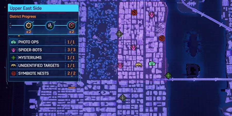 这篇内容介绍了《漫威蜘蛛侠2》中哈莱姆、上西区等多个区域的全收集完成指南,展示了各区域的拍照点、蜘蛛机器人、共生体巢穴等收集要素的完成进度与位置分布,助力玩家完成全区域探索。