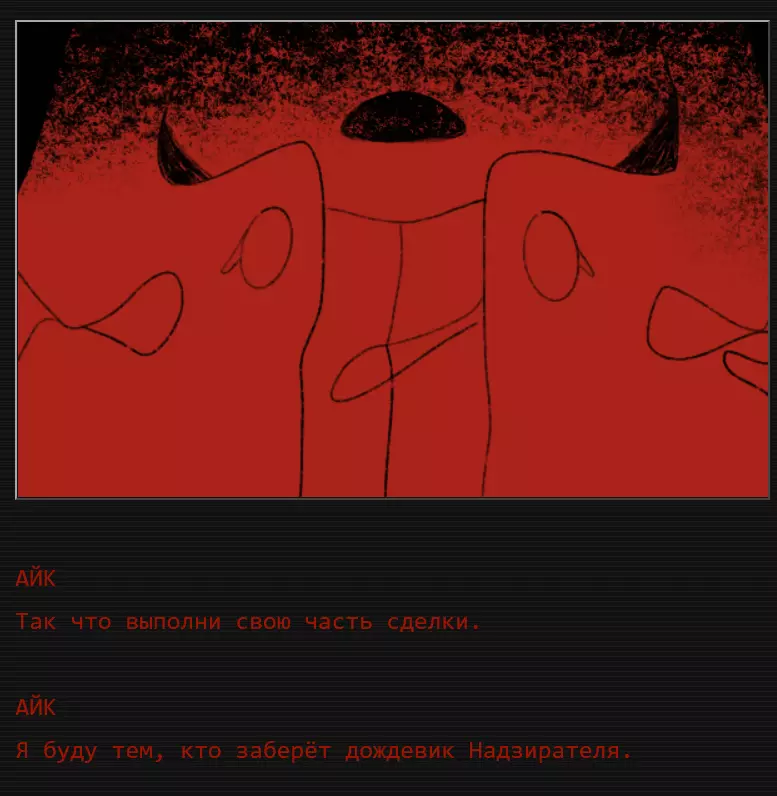 故事(含剧透) 游戏以进入某个穹顶时的标准欢迎语开场,但展示的是来自“ЁЁКРОН”穹顶的欢迎语,该穹顶据说是一个与世隔绝、极其危险且阴森的地方。 艾克沉默地走在白色小路上,穿过各种可能是住宅的建筑,这些建筑由一条黑线连接在一起。