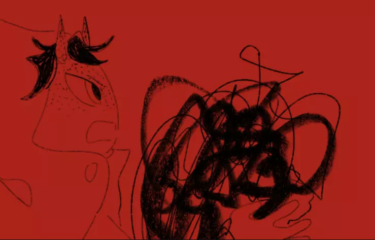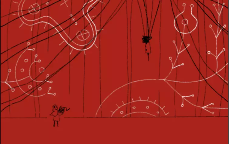 艾克在内部看到了熟悉的红色景象,但不知从建筑深处延伸出黑色的丝线。艾克走近了些,终于看到海诺被这些丝线悬吊着,而他身后则有着因自己的念动力而产生的绚丽图案。