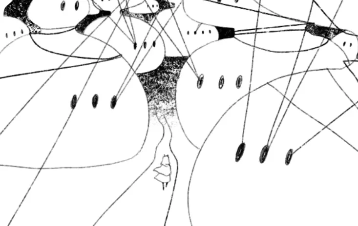 接着,他继续沿着白色小径前行,穿过布满黑色尖刺的田野,走向一座奇特的圆顶建筑,那建筑像一个黑色的洞口,将他吸了进去。