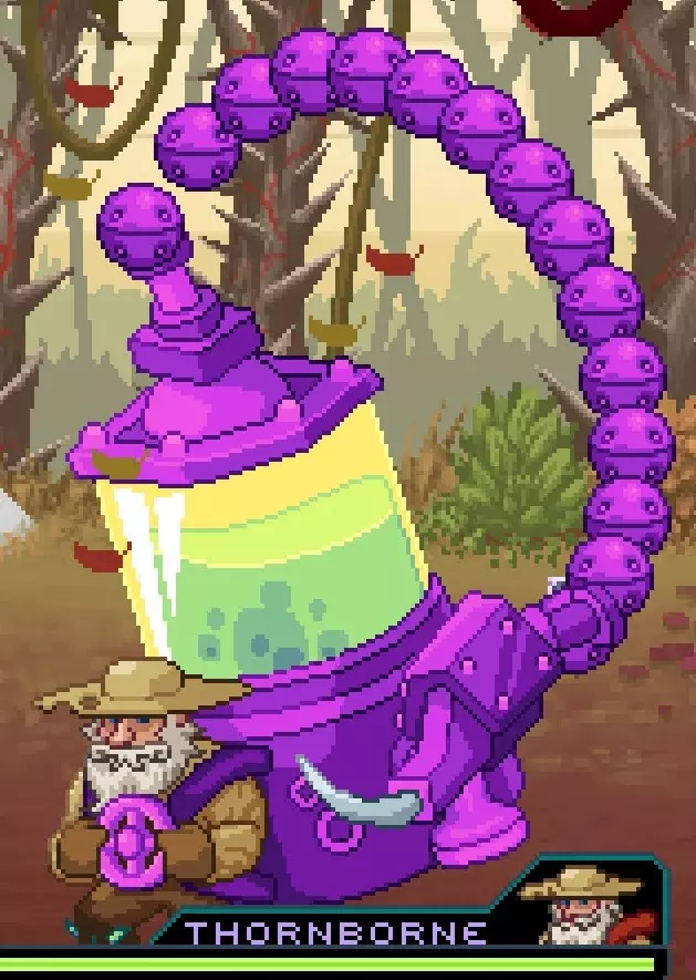 这个 Boss 在你面对他时完全是孤身一人,所以你只需专注于他和他的钻头。他会使用间隔开的三次钻头戳刺,然后钻击地面使一些岩石掉落。之后,他会再次向你戳刺三次,接着进行旋转攻击弹跳。幸运的是,除了掉落的岩石外,所有这些攻击都可以格挡。对于地面钻击攻击,你可以推开他来打断他的钻击,使其转而发动三次钻头戳刺。 如果你在应对他的旋转攻击时遇到困难,可以预判旋转攻击的弹跳轨迹,然后进行相应的格挡。如果你能预判并防御他的三种攻击模式,那么你只需使用超级技能 I 或 II 来加速 Boss 的 defeat 过程。 近战 W . P .. P .. P 钻击 W .C(当他开始钻击时) 旋转攻击 P...P....P(这招你只能相信自己的眼睛) 荆棘使者