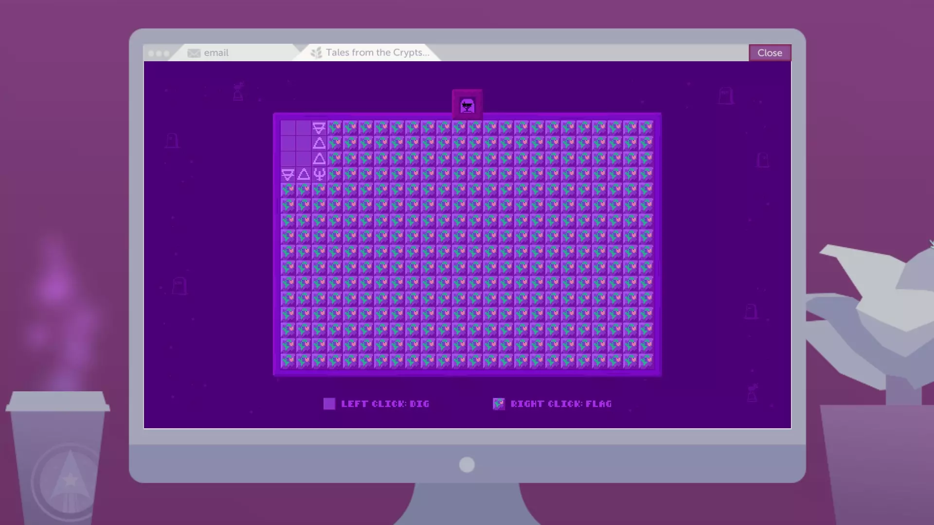 我不知道那个格子上是否可能有鬼魂,但如果发生这种情况(由于随机数生成),就重新开始。你也可以用正当的方式来玩(我不知道具体怎么做,因为我一直不擅长扫雷)。 感谢Oskuro,我们现在知道如何玩【墓穴扫雷传说】了:D 你的第一次点击是盲目的,只能点击并祈祷好运。 当你揭开格子时,会看到一个符号,指示该格子相邻的鬼魂数量,范围是1到8。例如,如果一个格子显示“1”,意味着周围8个相邻格子(包括对角线)中有1个鬼魂。如果显示“3”,则表示该格子周围有3个鬼魂。 如果你点击的格子附近没有鬼魂,相邻的格子会自动揭开,所以大片空白区域会自动打开。这款游戏的特别之处在于,每回合代表相邻鬼魂数量的符号都是随机的。比如在某一回合中,三角形可能代表“2”,而在下一回合中,圆形则可能代表“2”,你需要推断出这些符号所对应的数值。 扫雷游戏的最佳策略是:开始时随机点击,直到打开一片较大的区域,然后再开始进行推断。