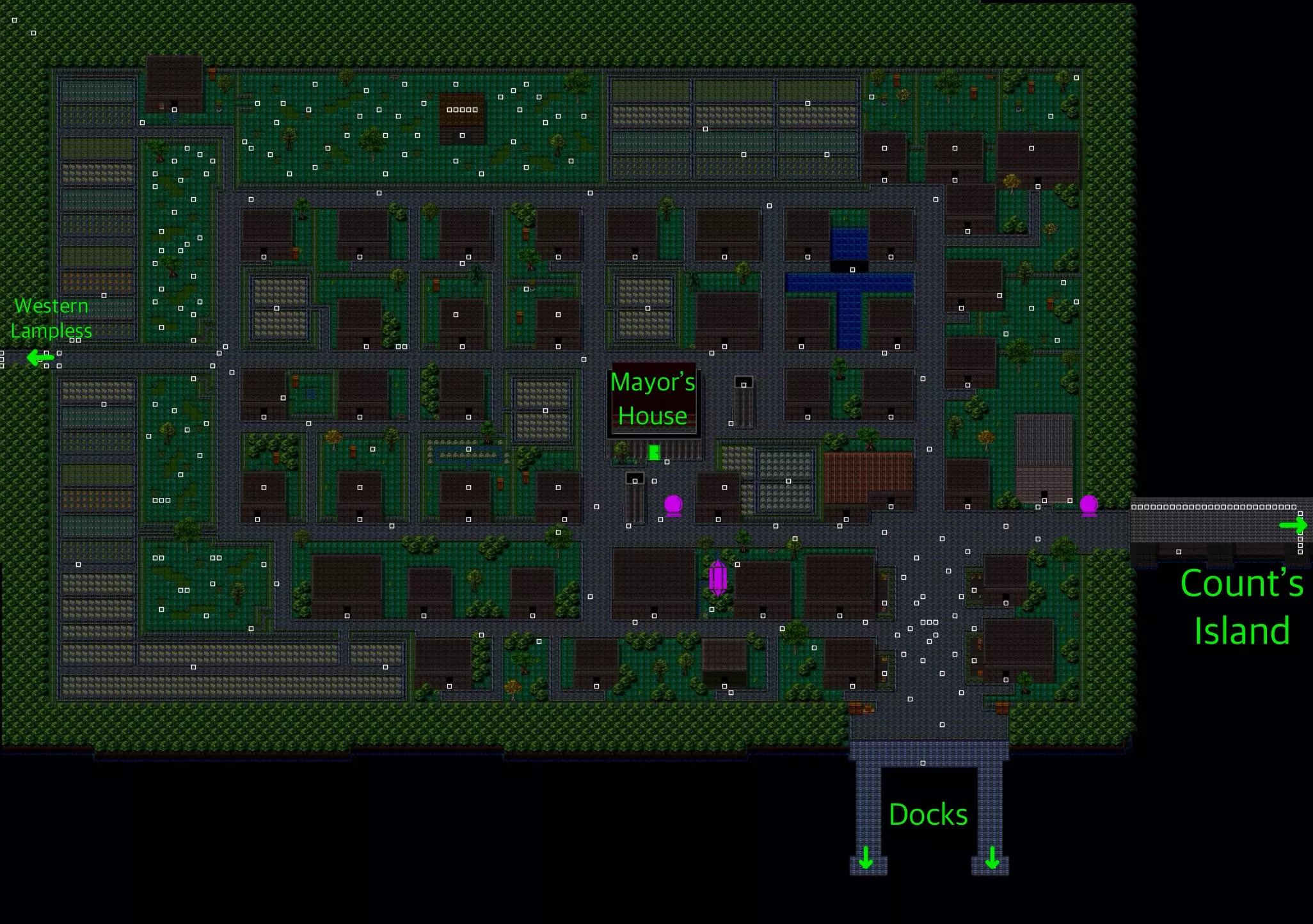 绿色叉号 = 码头 蓝色感叹号 = 互动点 红色骷髅头 = 敌人基地 注:海洋中散布的白色方块只是RPG制作大师引擎中的【事件】,莱夫会在其中设置一些轻度【事件】,为玩家提供一些轻松体验。 由于游戏仍在开发中,我从莱夫那里得知,未来会在拉兹克东部新增一个码头。因此,若后续补丁说明中提及地图有任何变动,我会相应更新此地图。 无灯区