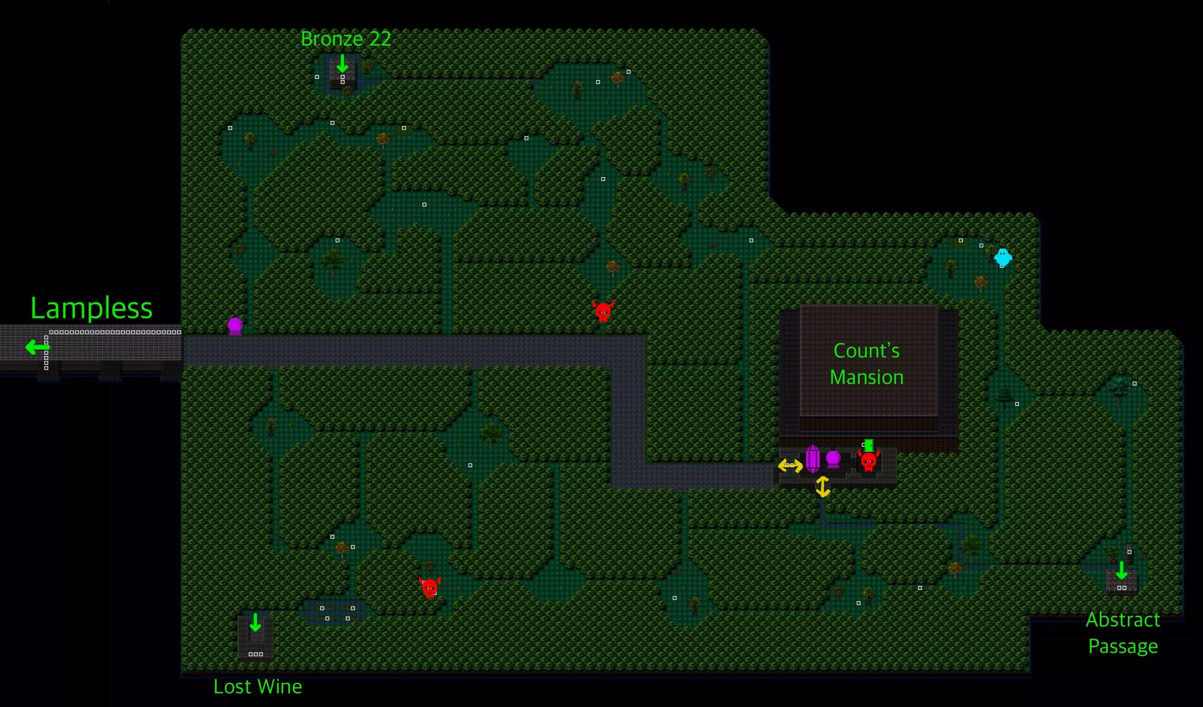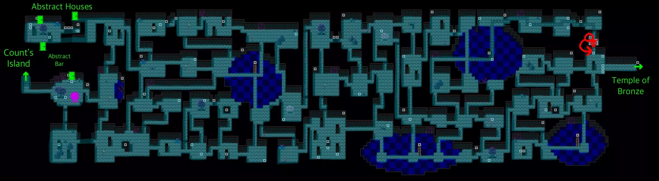 抽象通道是连接伯爵岛与青铜神庙(通常需乘船前往)的地下迷宫。 西侧是伯爵岛的入口。入口附近有【抽象酒吧】,其上方是【抽象房屋】。这些房屋中居住着一些红色幽灵,它们并无危害。除此之外,走廊内还有怪物游荡。 东侧是青铜神庙。附近有一扇上锁的大门,但如果你绕远路并击败守护开关的 Boss,就能打开这扇门。 我已标出你可以行走的路径——祝你顺利通过这条通道!
