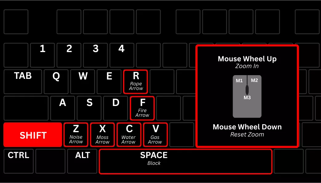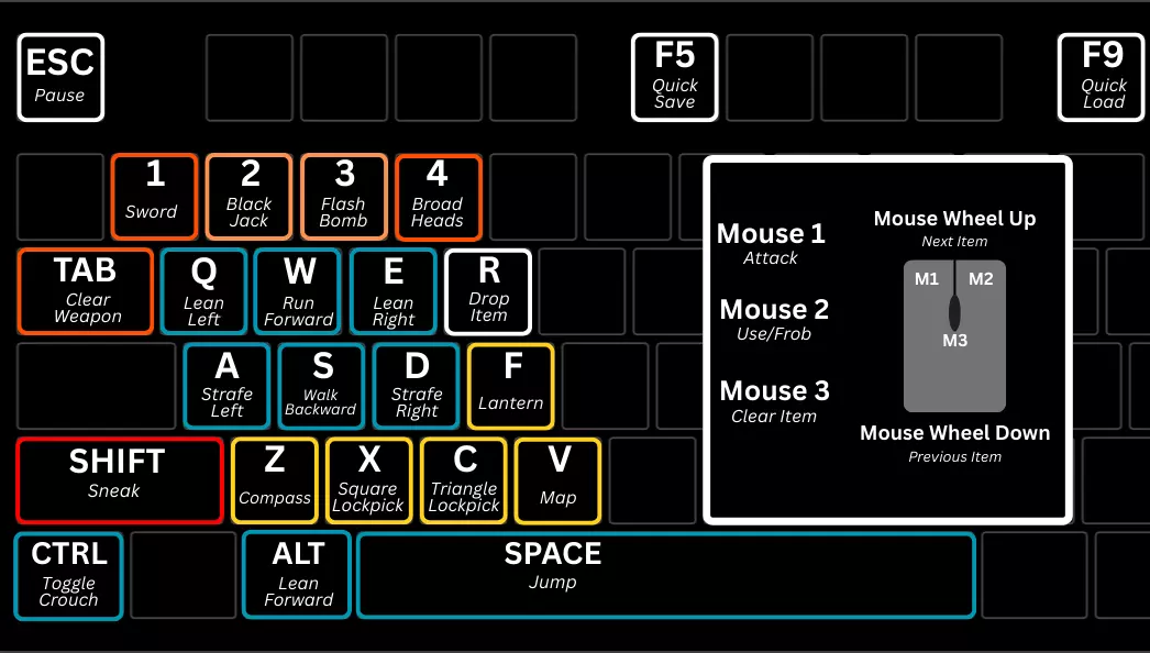 《神偷黄金版》新增《神偷2》的缩放机制(左Shift+鼠标滚轮上下) 下载灯笼模组后,灯笼默认按键为F(无需在配置文件中手动绑定灯笼按键) 本模组目标:让玩家能通过WASD移动键附近的按键快速使用加勒特的所有重要工具和装备。 控制方式整合如下: 左Shift+主键盘区按键组合用于特殊箭矢 实用快捷键:开锁器(X和C)、指南针(Z)、地图(V)和闪光弹(3键) 左Shift+空格键用于格挡机制 左Shift+鼠标滚轮用于缩放机制 适配Jax64的尖端灯笼模组(F键) 现在你操作的左手可以保持在原位,无需在键盘、数字键区和功能键之间来回移动了。按键绑定快速参考 基础控制