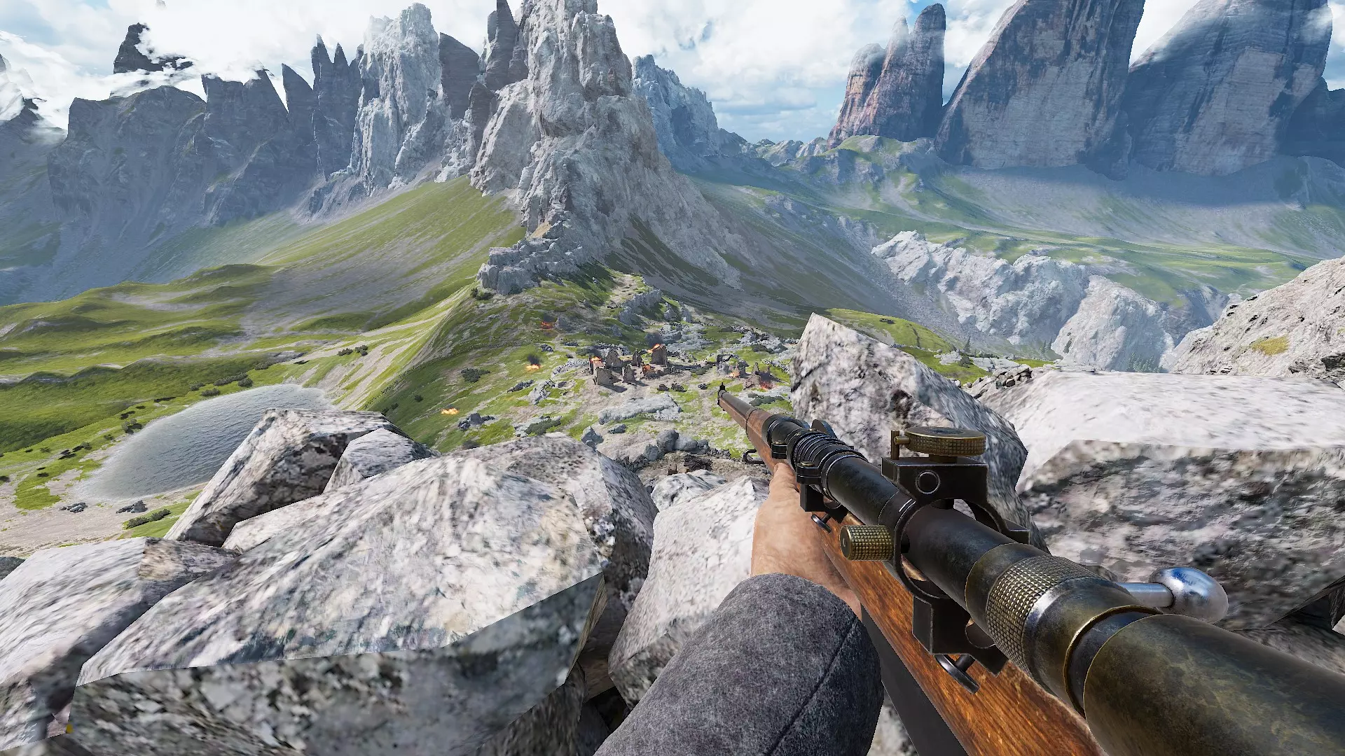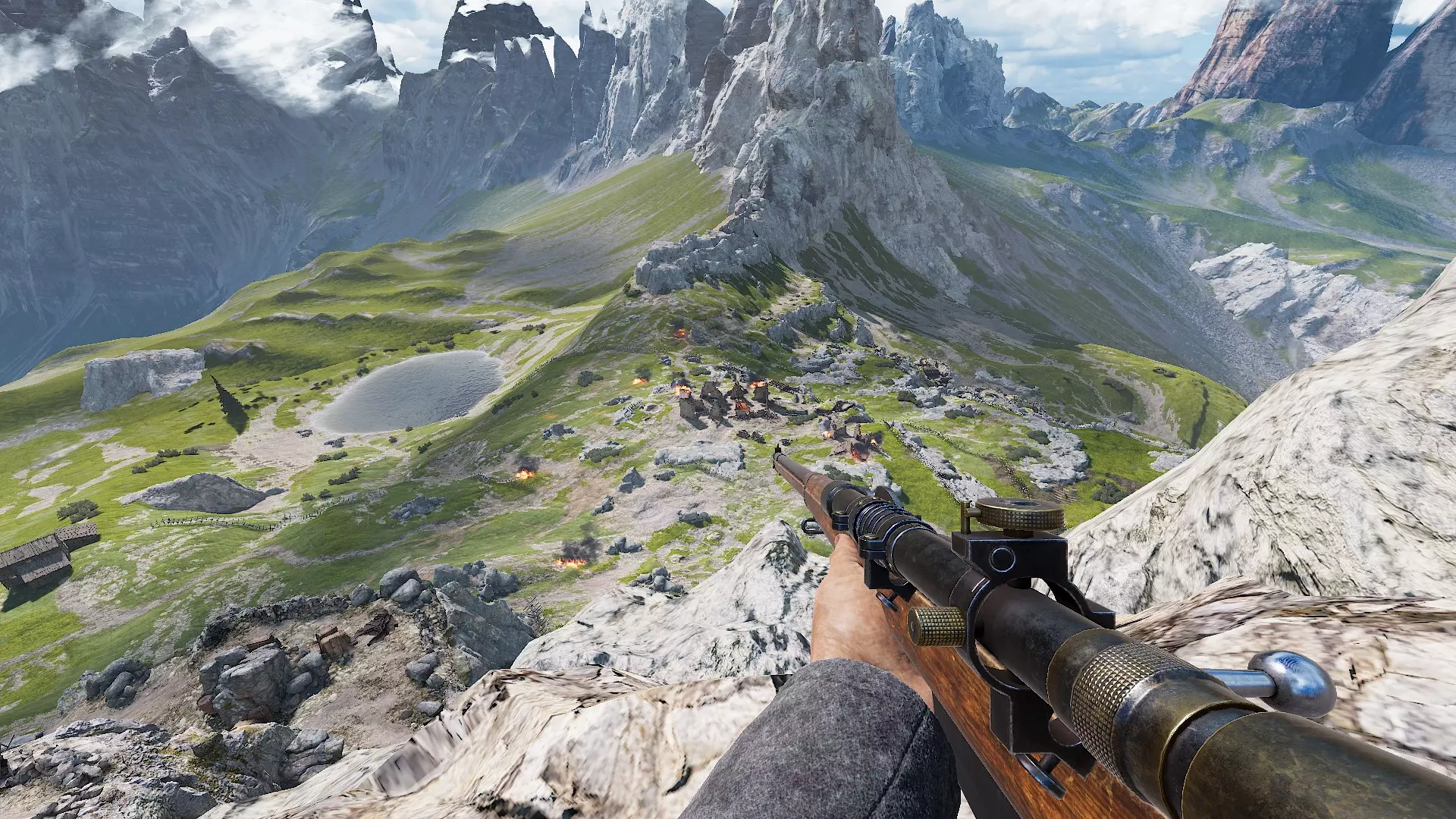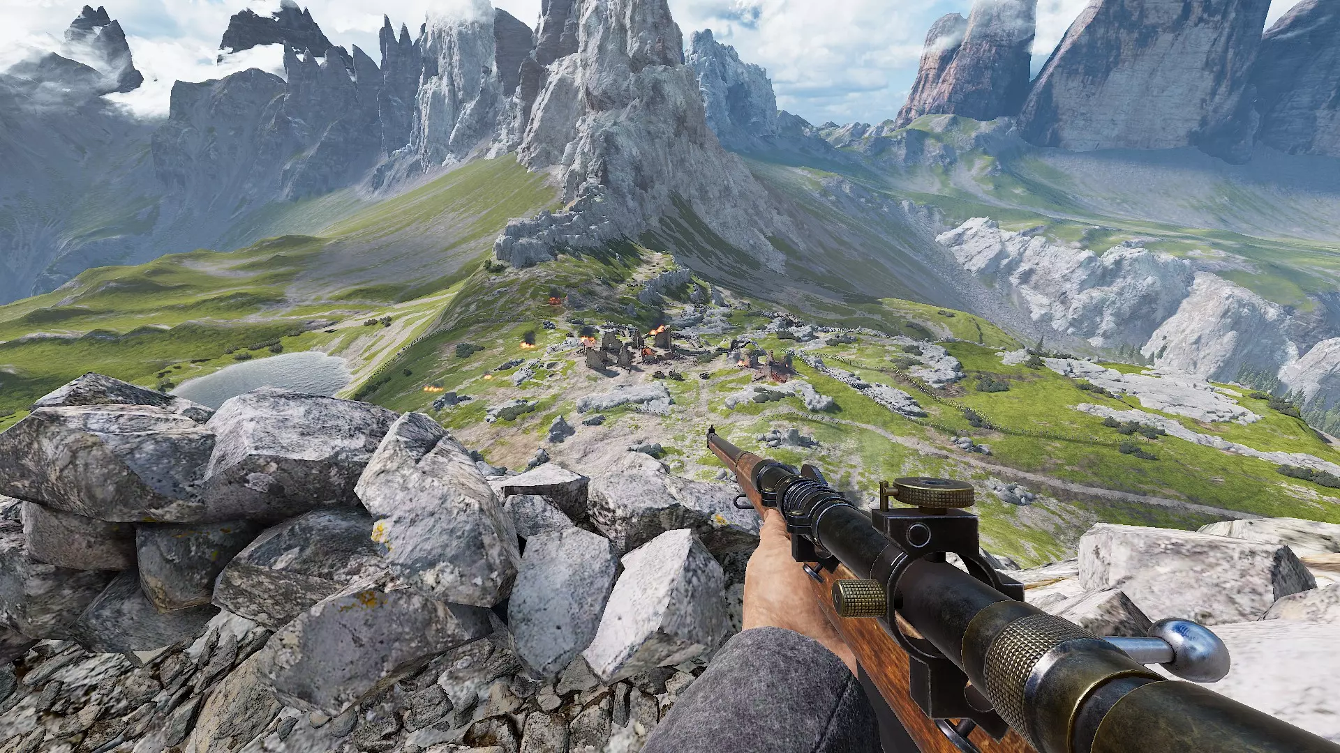 站位 狙击手依赖良好的站位。寻找能清晰观察到敌人可能路线的高处。保持隐蔽,避免引起敌人注意。 以下是在多洛米蒂地图上使用带瞄准镜步枪的良好位置示例:
