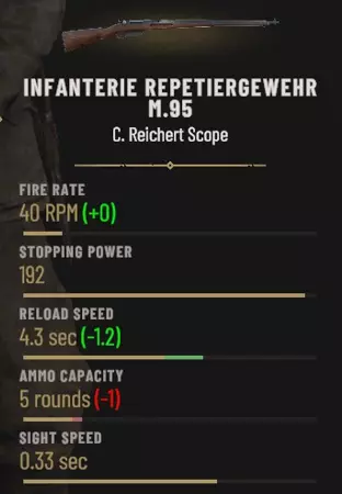 武器配置 使用合适的武器配置能让你在战斗中发挥显著效果,并带来巨大优势。如果条件允许,你应始终使用带瞄准镜的栓动步枪,例如M95或1891卡尔卡诺步枪。机械瞄具也相当不错,但要注意,远距离射击会有些困难,需要更高的精准度才能命中目标。 副武器的选择取决于个人偏好,除非你陷入与敌人的 trench fight,否则不会经常使用它们。我在奥军阵营使用弗罗默 Stop 手枪,在意军阵营使用格利森蒂手枪。需要提醒的是,左轮手枪 reload 时间较长,但停止力极强,在某些情况下可以一击毙敌。 我的武器配置: