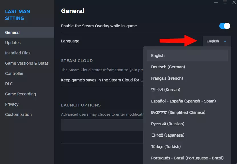 Last Man Sitting团队为员工提供了Steam平台《Last Man Sitting》的游戏内语言更改方法:右键点击游戏打开「属性」,在属性页面的Language选项中选择想要的语言即可。