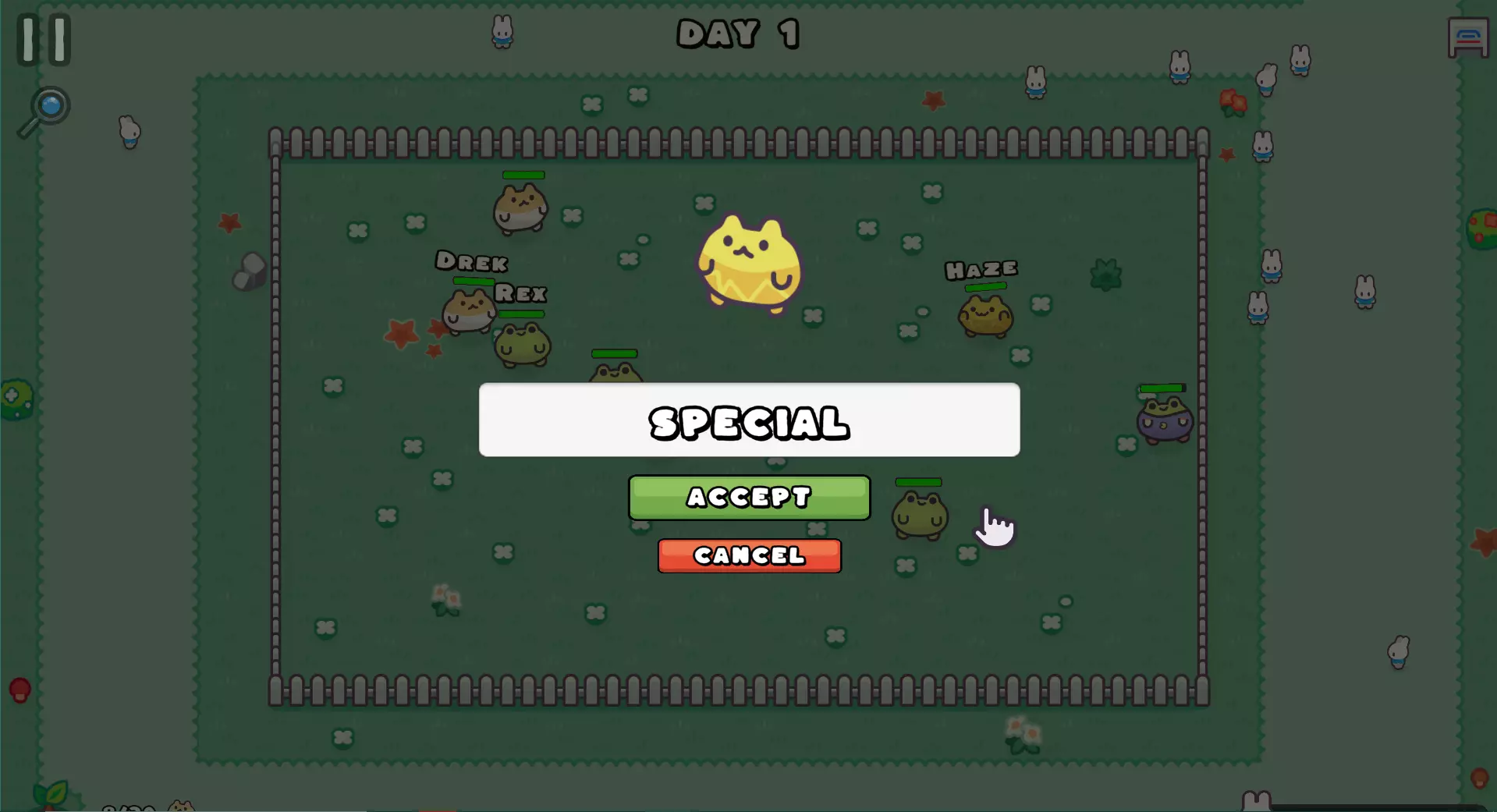 昼夜机制: 白天持续2分钟,夜晚农场关闭,并显示当天和季节信息。在此期间,可能会发生30秒的夜间事件,当被吞噬的访客计量表低于30%或高于60%时启用该事件。 情况如下: 若低于30%:将发生正面事件→获得一只随机生物。 若高于60%:将发生负面事件→你的生物会受伤,健康值降低。 释放生物: 如果想腾出围栏空间,可以将生物拖到围栏外进行释放。这样,10秒后若不再捕捉它们,生物会自行离开。释放访客: 若生物携带访客,按住该生物2秒即可让其释放即将吞噬的访客。若释放时生物处于围栏外,访客将能够行走并回到其正常路线。 训斥生物: