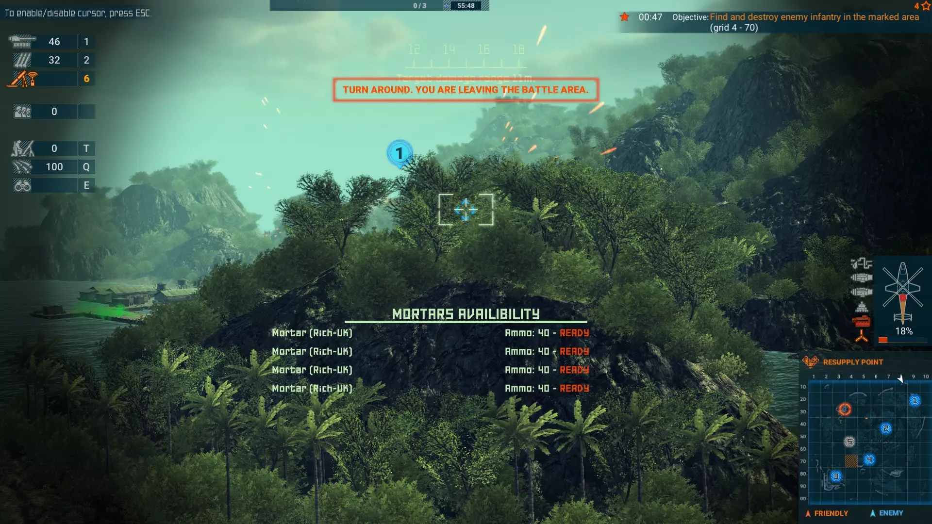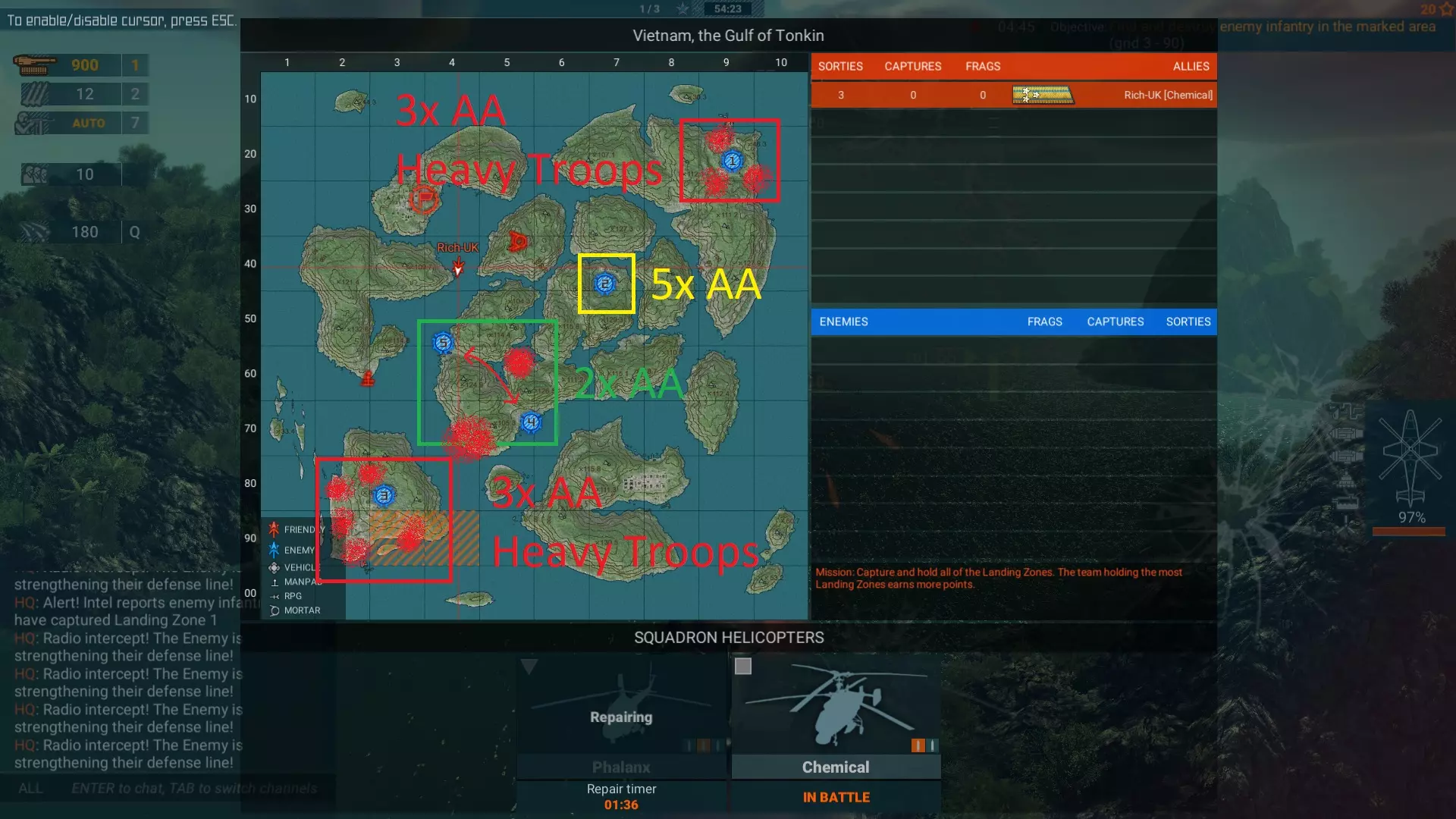从西北方向接近是清理这个基地的好方法。该基地有5个防空炮阵地,但你可以缓慢推进,一次只暴露一个防空炮,然后用机炮将其摧毁。 任务目标: 你有两次任务失败的机会,第三次失败将导致战斗结束。你需要四处快速移动,确保完成任务目标,同时在任务间隙进行重新占领。通过一些练习,你可以做到这一点。不要让任何基地处于橙色状态或部分人员驻守状态,因为这会触发一个要求你填满基地所有位置的任务目标。让战斗给你一个消灭敌军的任务目标会更容易,因为你可以用火箭弹打击他们,然后迅速进行下一个任务。你不是要赢得这场战斗,只是为了获得勋带。 祝你好运!