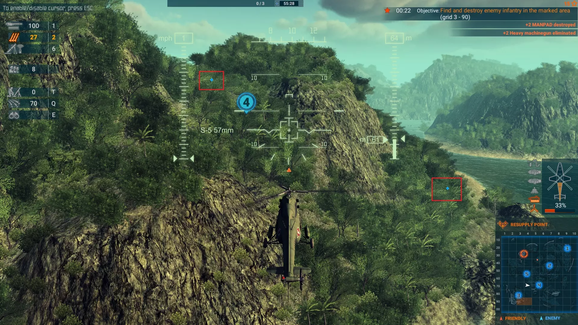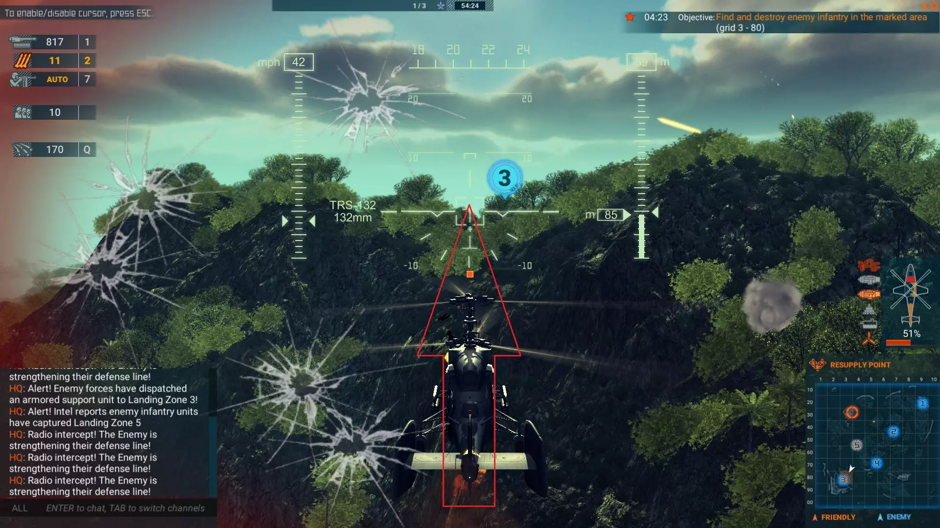 地图上我用红色标记标出了几股敌方地面部队,这些会对你构成威胁。基地1和基地3的防御最为坚固,很可能会导致你多次被击落。化学型直升机配备132毫米火箭弹,非常适合清除大规模部队。