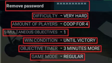 战斗设置 我使用的战斗设置如下: 设置密码,防止他人加入你的游戏并抢占据点。 选择4人合作模式,这样敌人会更快地占领基地。 将同时进行的任务数量设为1,避免在时间结束前失败。 胜利条件选择“直至胜利”,因为你几乎需要整整一小时才能完成任务。 任务计时器增加3分钟,让你在完成任务前有更多时间进行准备。 游戏模式选择常规模式,以获得一定的生存能力。