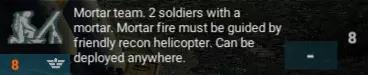 化学型直升机将配备舱门机枪手 这样一来,你的第一代中队点数将为142点(总可用点数150点)。 在战斗开始时部署迫击炮