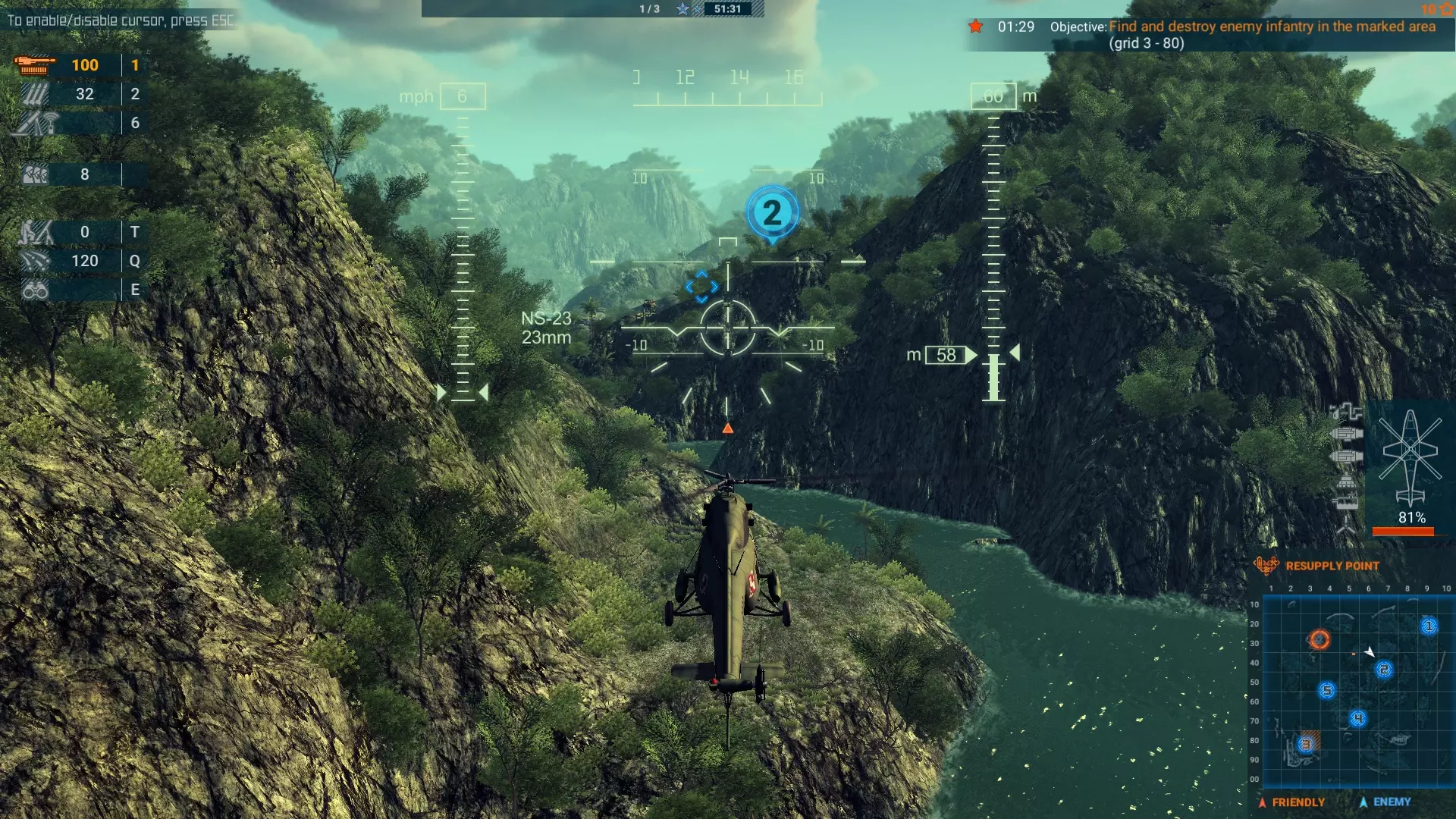 在此处着陆并面朝这个阵地,你将有足够的时间释放一组部队,并在部队离开直升机时向他们开火。基地1