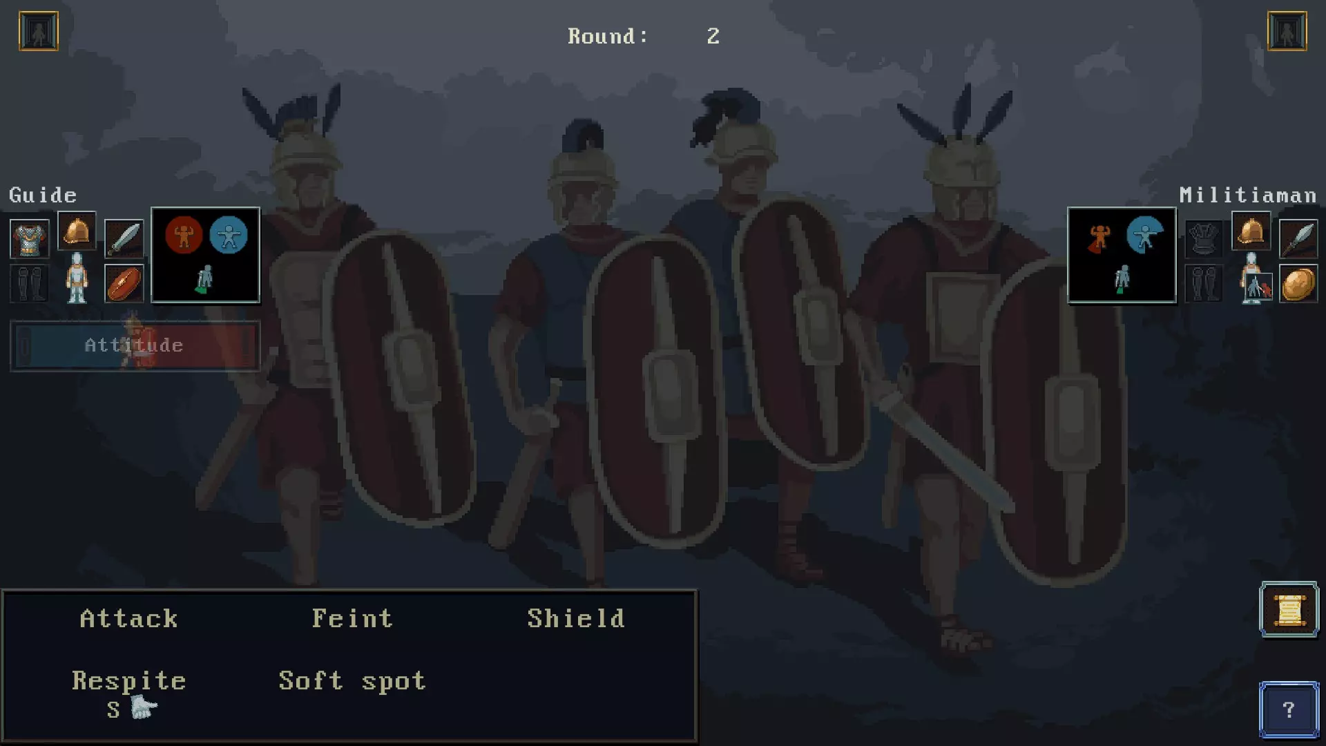 战斗分为两种类型:耐力战和限时战。耐力战需要在一定回合数内对抗无限敌人;限时战则是对抗有限数量的敌人,若快速击败他们,你将获得声望和士气加成。 在耐力战中,大约在第20回合左右,百夫长会下令轮换战线,此时敌人会刷新,但你的蓝色姿态条将被填满,并且疲劳等级会降低1级。 如果你晋升为百夫长,那么你可以选择不参与轮换,从而获得声望和士气加成,但敌人仍会刷新;或者你也可以选择主动轮换,但这会导致声望和士气下降。 图片内容为战斗界面。在左侧和右侧,你可以看到你和敌人的蓝色姿态圈、红色生命值圈以及下方的疲劳条。你还能看到他们装备了什么。这名民兵没有护甲,所以躯干受到的攻击将造成全额伤害。如果他有护甲,我可能会攻击他的手臂,因为手臂似乎从来不会被任何装备覆盖。 在左侧你的状态下方,你会看到态度条。这会影响你的姿态。红色一侧代表进攻,蓝色一侧代表防御。处于防御姿态时,你的准确度会下降,防御力会上升。因此双方的准确度都会降低。如果你采取左侧的防御姿态,每回合都会损失士气。不是立即损失,但如果防御时间过长,就会开始损失士气。它最适合在试图恢复体力时使用,或者在耐力战斗中接近第19回合左右,当你只想平稳撑到结束时使用。在红色的激进姿态下,你的攻击会更精准,但敌人的攻击也会更精准。在耐力战斗中,最好不要采取激进姿态,可能需要全程进行佯攻,这样你就不会杀死敌人,也就不会换上来一个体力充沛的新敌人。同时,如果你持续佯攻且不杀死敌人,他会变得更加疲劳,击中你的可能性也会降低。不过,当百夫长让你轮换时,这一点会受到影响。然而,你获得的每一次击杀都有助于提高最终得分,所以这取决于你是乐观主义者还是悲观主义者。你是想比敌人后死,还是想让敌人比你先死?在限时战斗中,你需要完全采取红色激进姿态。在屏幕底部,你可以看到可执行的行动。在战斗状态下,你会看到各个身体部位以及一些指示条。底部可以切换身体部位和该部位的伤害倍率。每次攻击有两个指示条。H代表命中率,当指示条满格时,你的命中率最高;当指示条为空时,命中率最低。A代表攻击穿透护甲的几率。护甲有覆盖率,某个身体部位的覆盖率是指护甲阻挡该部位伤害的几率。护甲阻挡的伤害值显示在你物品栏的护甲信息中。当伤害超过该阈值后,剩余伤害将正常生效。 接下来是佯攻。共有3种佯攻,每种佯攻有两个指示条。左侧的指示条表示佯攻是否成功。右侧的拇指图标表示是否能无视对方的抗性。 盾牌对佯攻更有效,但如果佯攻失败,你自身会失去姿态。拇指图标的含义与佯攻相同。 喘息和恢复分别用于恢复疲劳值和姿态值。 弱点攻击是一种特殊的攻击方式,能提高你无视对方护甲覆盖率的几率,但会降低命中几率。如果对手的护甲覆盖率为100%,则弱点攻击无效。 新迦太基 你参与的第一场大型战役将是进攻新迦太基。会有一段文本描述,之后你将进入一个类似营地界面的屏幕,但左侧只有“继续”选项。 在一段文本之后,你将有机会投掷标枪。这取决于你的标枪技能和士气。或者,你也可以尝试向特定目标投掷,这需要通过更难的检定,但成功后能提升士气、增加好感度,最好的情况是在你的功绩面板上记录一次击杀。之后战斗开始,这是一场耐力战,大约在第19回合结束。你可以花一些时间采取防御姿态,但要注意士气是否开始下降。在这里获得击杀可以提升你的士气。 在下一阶段,你需要通过一项技能检定,这将改变任务的后续部分。如果你失败了,就必须尝试攀爬城墙,这很可能会让你被箭射中,并在战斗间隙损失生命值。在这里有机会提升百夫长对你的好感度,但你可能会被箭多次射中。 另一个分支是绕过城墙,从另一个入口入侵。你将进入一场限时战斗,但如果在几个回合后耗时过长,且民兵仍未被击败,两名战友就会赶到并抢走你的击杀。(最近的补丁已改为共享击杀,因此盟友不会再抢人头了)。之后你会进入带有继续按钮的界面,然后开始另一场限时战斗,如果你再次难以对付民兵,会有另外两名士兵前来协助你。两条路线在此交汇。你会面临一个选择:不搜刮直接继续,或者如果你的美德值较低,可以尝试在途中抢夺一些战利品。接着,你需要在一场耐力战斗中做出选择,对手是数名雇佣兵,他们拥有高命中率、良好的护甲,并且能造成大量伤害。如果你选择了这个选项,就会陷入与一波又一波雇佣兵的耐力战斗中。除非你全程佯攻,试图让第一个敌人疲劳,然后采取龟缩战术。不过百夫长最终会把你包围。如果你存活下来,将获得100第纳尔的奖励,还有可能得到晋升。 之后,你会回到继续界面,并获得8点士气和80第纳尔,如果在与雇佣兵的战斗中存活,还会额外获得100第纳尔。 巧手有什么作用?以下是开发者在论坛帖子中对【武器熟练度】属性作用的描述: 【武器熟练度】非常重要。它以线性方式影响所有涉及武器技能的攻击判定(普通攻击、弱点攻击、佯攻)。 剑类武器的【武器熟练度】数值通常优于其他武器类型。 各武器【武器熟练度】数值如下: - 斧:51 - 匕首:63 - 法尔卡塔剑:60(与普通短剑平均值相当) - 矛:55 - 长剑:57 - 锤:55 - 罗姆斯帕夏剑:51 - 萨里萨长矛:40(别指望这能让战斗变简单。方阵战斗机制略有不同,希望在不久的将来大家能体验到。) - 西卡弯刀:60