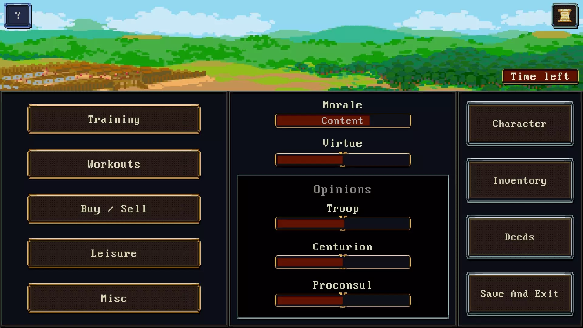 进入游戏后,你会看到这个界面。首先映入眼帘的可能是你的士气、美德和他人看法。 士气会影响你通过技能检定的成功率。尽可能保持高士气非常重要。休闲和其他部分提供了提升士气的方法。 美德会提供对话选项。高美德往往会触发降低士气的事件,而低美德选项则让你有机会获取战利品。因此,从游戏玩法角度来看,不道德或许是更好的选择,但这也取决于你想扮演一个老好人还是坏小子。 (编辑):评论区一位名为taitomagatsu的玩家提醒我,高美德会带来随机的声望提升、更早的晋升机会,以及游戏中最好的护胫甲。因为我总是扮演一个混蛋角色,所以之前并不知道这一点。看来高美德或许是更好的选择。 部队声望低时,会随机触发降低士气的事件,而且你无法进行更高级别的技能训练。高部队好感度则能让你成功进行更高级的技能训练。 百夫长声望会影响 scavenging 任务中收集食物的地点数量。根据我在有晋升资格却因无空缺而无法晋升时看到的文本,它还会影响晋升机会。 总督声望没有固定的提升或降低方式。事件中的一些文本选项会对其产生这样或那样的影响,但如果有通过营地行动来提高它的方法,我还没找到是哪一种。 训练。顶部的两个选项是标枪和单人训练。单人训练能让你的剑术达到40,期间可能会有几次失败。当剑术达到40后,你会收到一条消息,提示你已经超出该训练的提升范围。 标枪训练受你的协调技能影响。在事件中成功使用标枪可以提升士气,还可能改善多个人对你的看法,最好的情况下甚至能为你的最终评分增加一次免费击杀。失败则可能导致声望下降和士气降低。中间还有一些效果较弱或无效果的选项。 格斗训练。任何人都可以进行基础的格斗训练。良好和最佳级别的格斗训练只有在部队对你评价为正时才能成功进行。越往下选择,训练带来的技能上限提升越高。格斗训练会提升你的盾牌或剑术技能。盾牌技能会影响盾牌攻击,这种攻击的效果远胜佯攻。在训练选项上方有一个滑块,可让你决定更侧重训练哪项内容。 体能训练能提升你的身体属性,但无法提升精神属性。精神属性可通过成功完成觅食任务来提升。 买卖功能会提供随机的物品选择,这会占用一部分营地时间。如果你不喜欢当前的物品,可以再次尝试以获取新的随机选择。除非你在角色创建时没有足够点数来升级初始装备,否则这通常是浪费营地时间,因为有机会通过战利品获得更好的装备。例如,在觅食任务中,你可以尝试从城镇获取食物,可能会收到城镇看起来很可疑的提示。你会获得进入城镇或离开的选项。进入城镇后,你可能会与一名掉落短链甲的匪首战斗。还有一个随机营地事件,你可以从武器 smith 那里获得一把不错的剑,其属性为普通或强化,取决于你是否通过该事件。此外,还有一个事件,如果你赢得赛跑,就能获得一顶优质头盔。 休闲活动提供提升部队好感度和士气的方法。闲逛有机会提升部队好感度和士气各1点。赌博同样能提升,但可使士气和好感度各提升1或2点。这两项行动基于你的魅力属性。桌游类似于赌博,但基于你的智力属性。最后一个选项会降低你的美德值,如果你想避免某些降低士气的事件,这可能是有益的。不过10第纳尔的花费可能会逐渐累积起来。 杂项部分有提升士兵和百夫长好感度以及影响士气的选项。额外巡逻可能没有任何效果,也可能提升士兵和/或百夫长的好感度,最后还可能让你陷入战斗。战斗是限时的,所以要快速完成,这会提升好感度和士气。战斗中的杀敌数会增加你的最终评分,并提升好感度和士气。战斗还可能提供可掠夺的装备。守卫任务类似于额外巡逻,但不会随机触发战斗,而是会降低你的士气。额外训练需要你晋升两次,一旦满足条件,进行额外训练可以提升好感度,且没有负面影响。献祭需要花费40第纳尔,但能提升士气,提升幅度大概在4到20之间。角色界面显示你当前的属性。物品栏可让你查看装备,若有多余装备还能进行更换。事迹界面会展示你已击杀的敌人和获得的奖励。此外,你还可以进行保存并退出游戏。 战斗