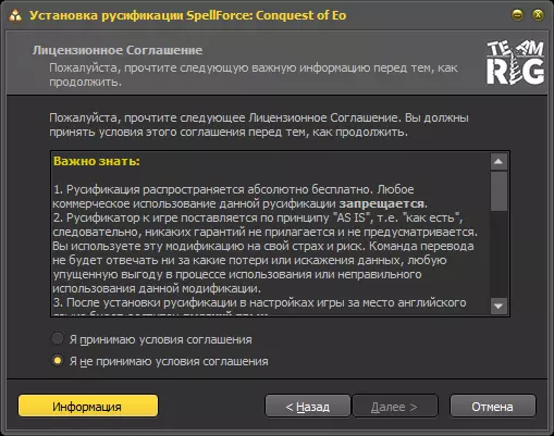 Team RIG制作的俄语本地化补丁,保持原版风格。为追求美感,安装程序界面采用了《咒语力量:征服伊欧》系列游戏的配色进行设计! 说明: 本本地化补丁完全免费发布。严禁将本本地化补丁用于任何商业用途。 本游戏本地化补丁按“现状”提供,即不附带任何形式的担保。使用本模组的风险由您自行承担。翻译团队不对使用或误用本模组过程中可能造成的任何数据丢失或损坏、任何收益损失负责。安装俄语化补丁后,游戏设置中英语选项将替换为俄语选项。使用俄语化补丁不会导致账号被封禁。该汉化补丁与Steam平台兼容,并已适配游戏最新版本。安装汉化后,不建议运行缓存完整性验证。所有未在此明确授予的权利均归版权所有者所有。参与翻译人员: 项目负责人 - Константин Носов 技术部分: Владимир KitchenThinker Евгений Попов Decoder Юрий Васильев gogibeet(早期阶段) 文本翻译: Константин Носов Денис DENverVarna Catherin Eller catherin_1 Владимир KitchenThinker 设计: Константин Носов 测试: Николай Мишечкин Nick Xendzov Александр Меркушев Smerk88 Александр Кузнецов Letho Никита Куц KuN1tSa Гриша Ys6v9d 截图及删除顺序: