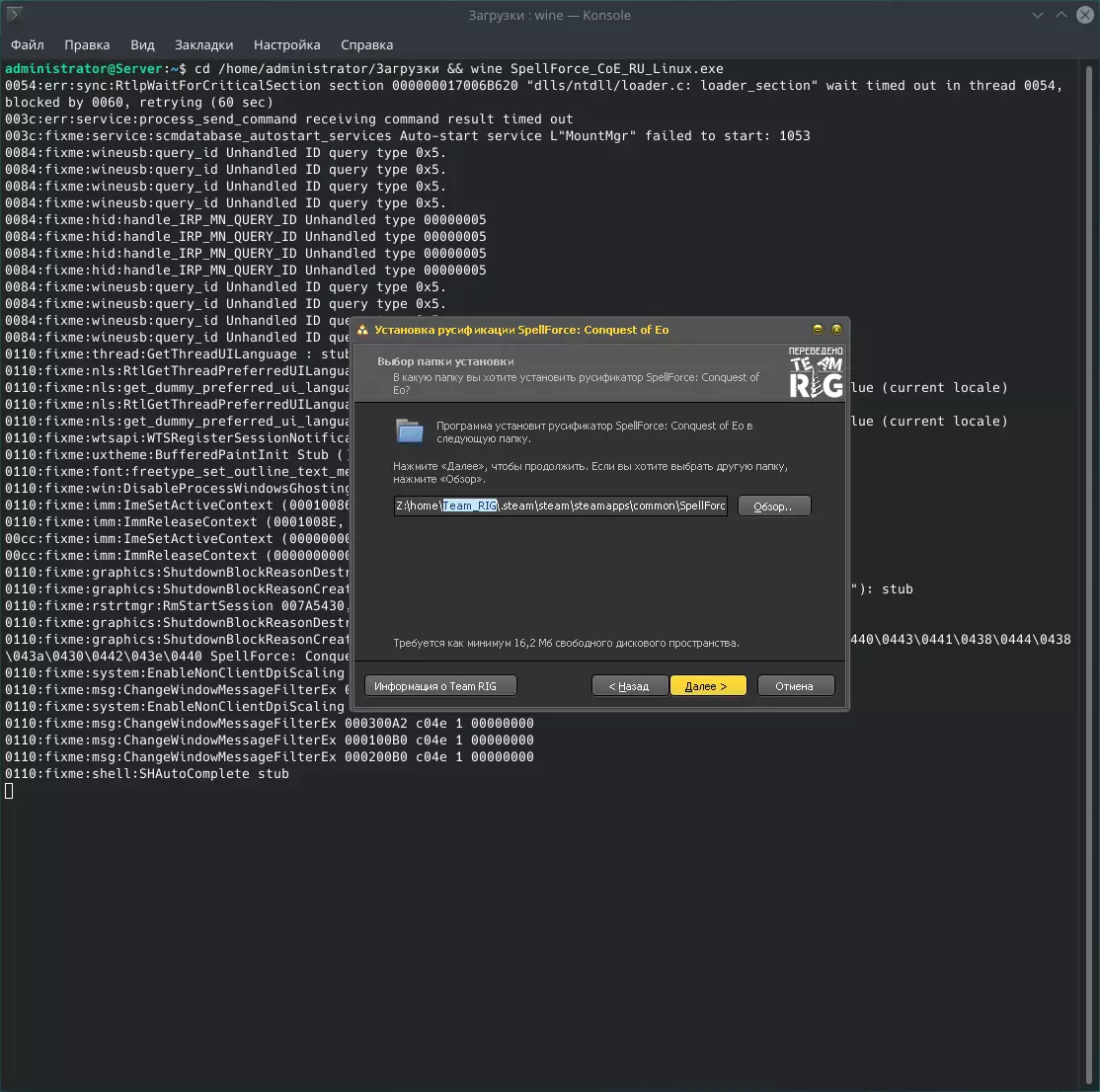 在Linux系统中安装俄语本地化补丁时,需将TeamRIG替换为您的账户名称。
