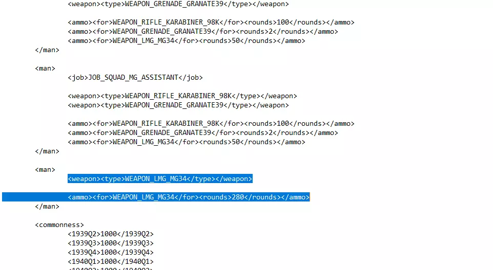 将<weapon><type>WEAPON_RIFLE_KARABINER</type></weapon>替换为<weapon><type>WEAPON_LMG_MG34</type></weapon> 你可以修改下方标记为<ammo>的弹药数量,将50发更改为你想要的数值。你也可以移除步枪弹,因为你的单位将不再使用步枪。 对其他步枪兵重复此操作,即可组建一支全员装备机枪的小队! 我已经尽我所能进行了解释,如有疑问请提出。如果有人需要,我会制作关于如何修改坦克装甲的教程。
