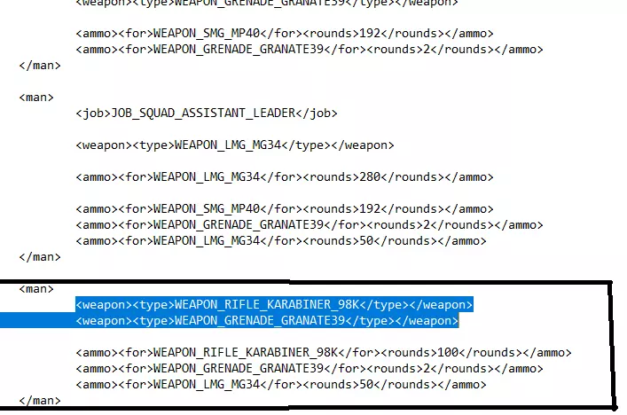 你需要复制高亮显示的文本,格式如下:<weapon><type>WEAPON_LMG_MG34</type></weapon> 不要复制弹药部分,因为你之后可以更改它。现在滚动到步枪兵,我已在下方将其高亮显示。