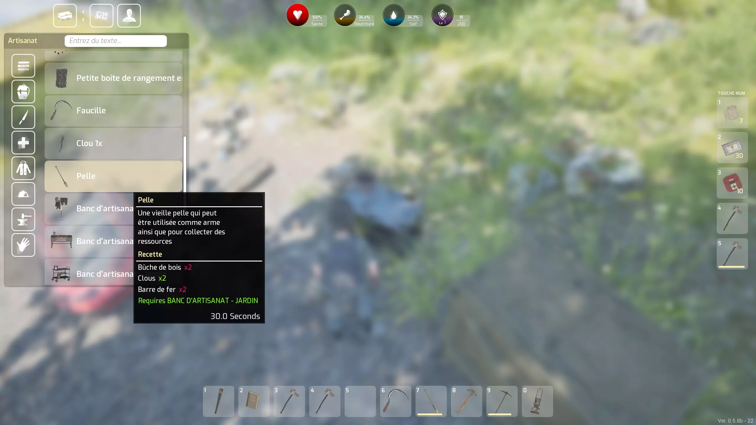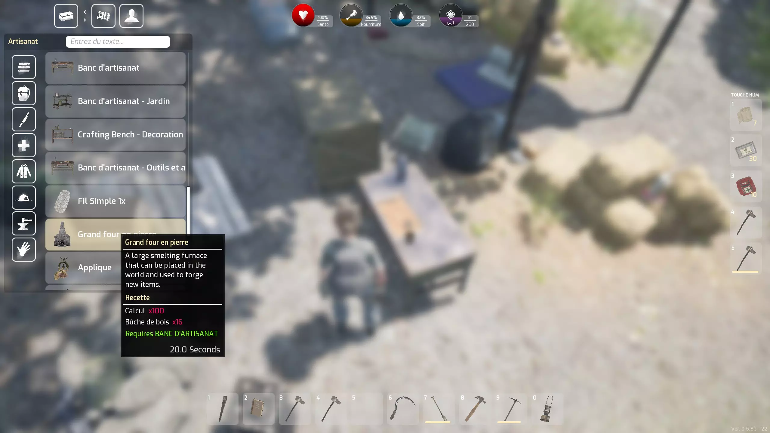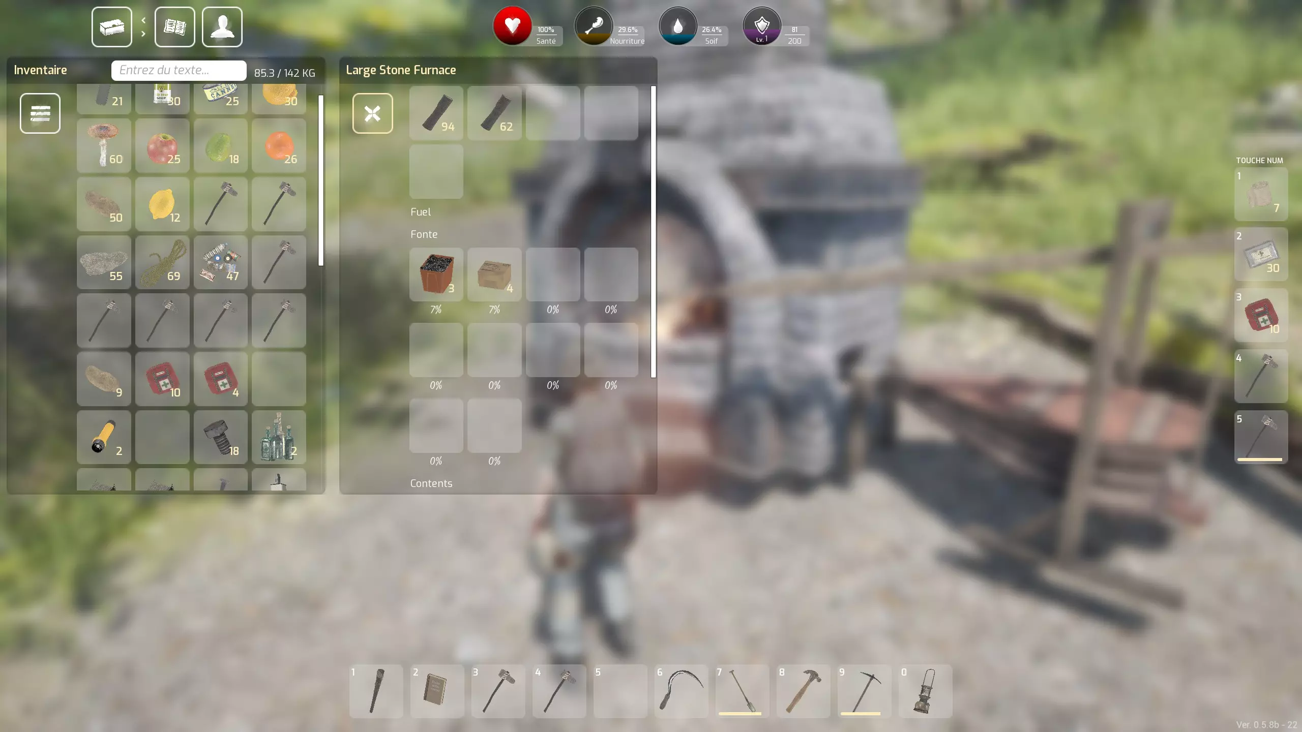 不过正如我在上一章末尾所提到的,如果我们想要提高产量,就需要工具,主要是用于开采金属的镐子和挖掘沙子的铲子。一旦我们拥有了这两样工具,就可以查看地图来定位那些可开采的“矿藏”。例如,一个开采过的金属矿点,通过改良熔炉,我一次就能生产出26块铁锭,这会让情况“略有”改变。当然,这些工具会有磨损,但比斧头磨损得慢很多,所以最好对它们进行修复。要制造这些工具,我们需要两个新的锻造台。
