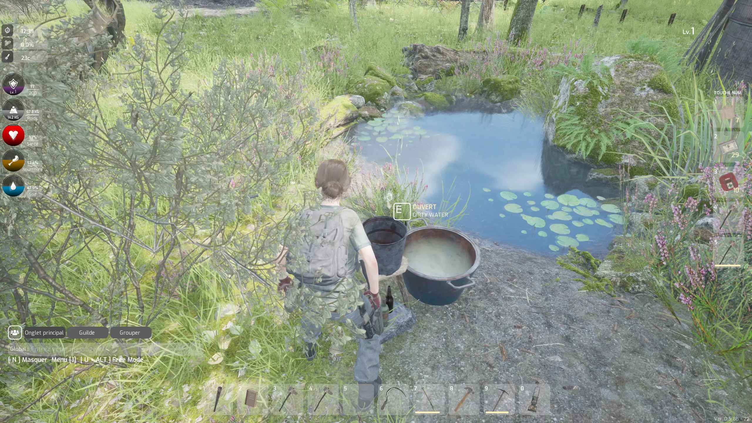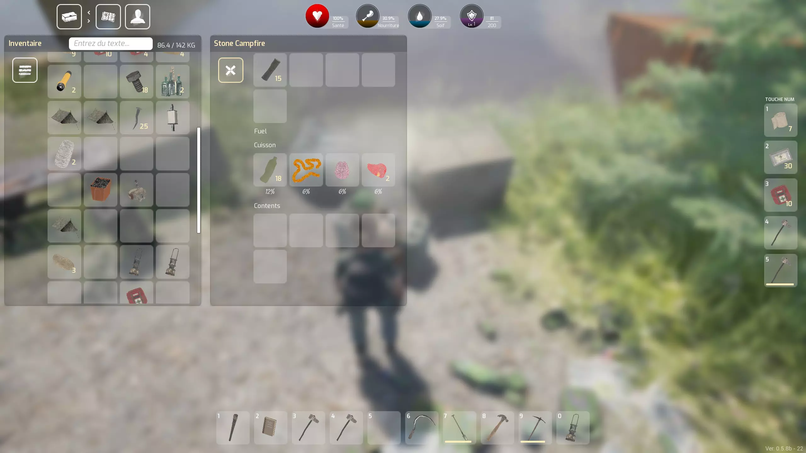 你的第三要务是找到水源并通过营火将其煮沸。尽管你可能会找到一些水瓶,但它们无法满足你的需求。 在这款游戏中,基础燃料始终是木材。即便你的炉子、营火及其他设备会产生大量木炭,但据我所知,这些木炭目前仅用于制作农业用肥料,而我们现阶段还远未涉及农业。 你可以在小池塘、附近的水箱中找到大量水源,也能找到呈(淡黄色的)“旧水瓶”形式的水——但这类水不能直接饮用。