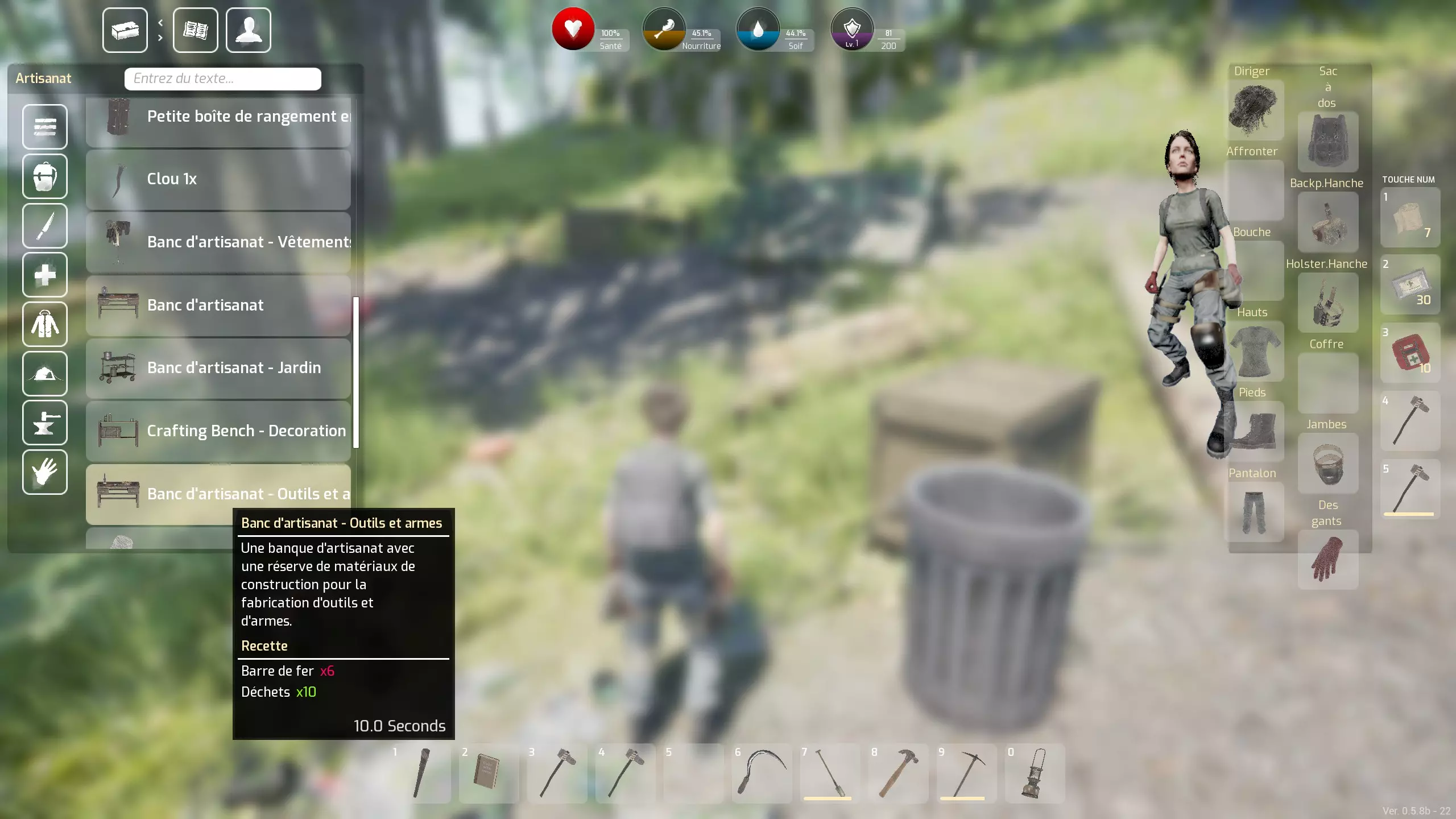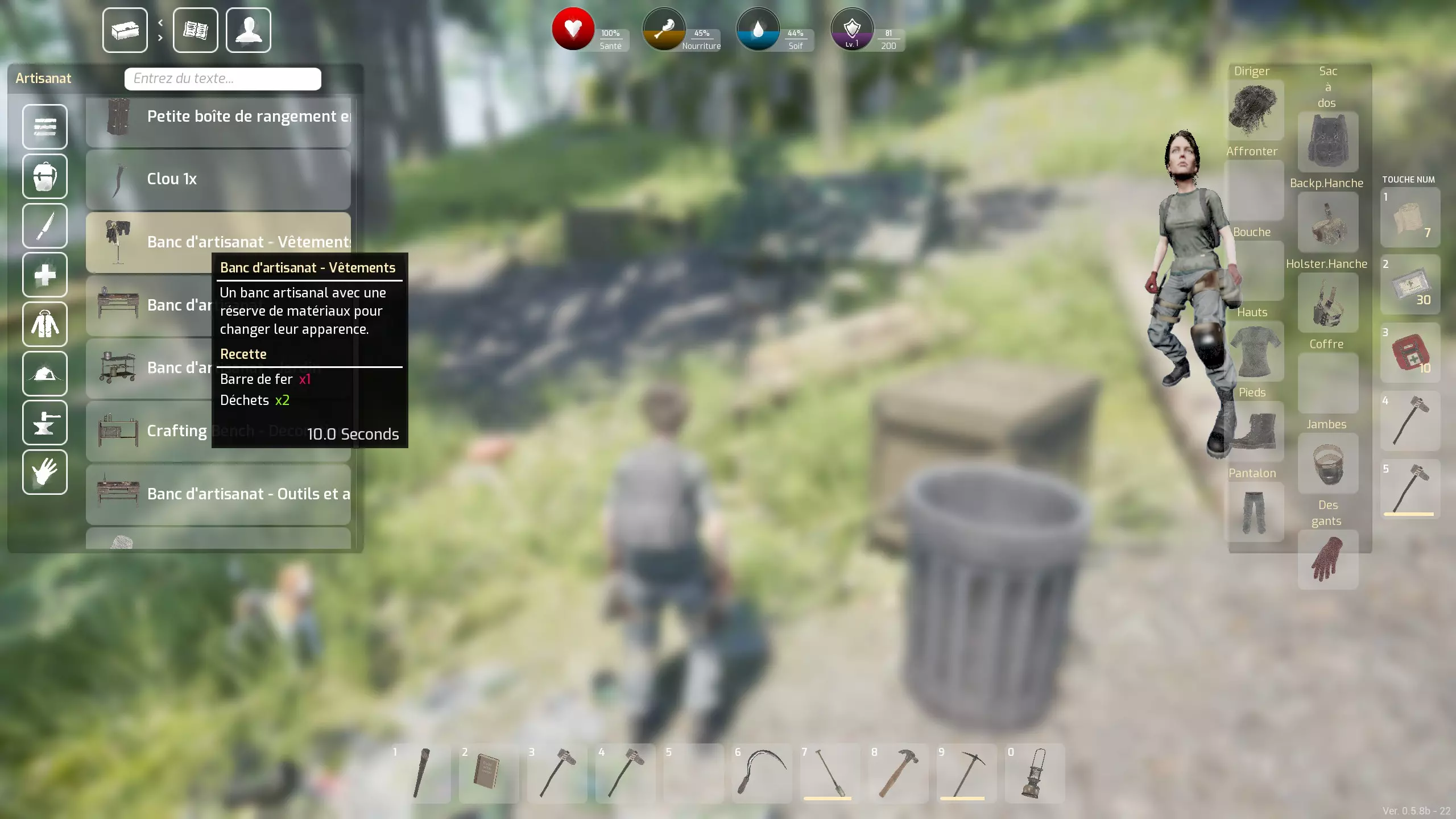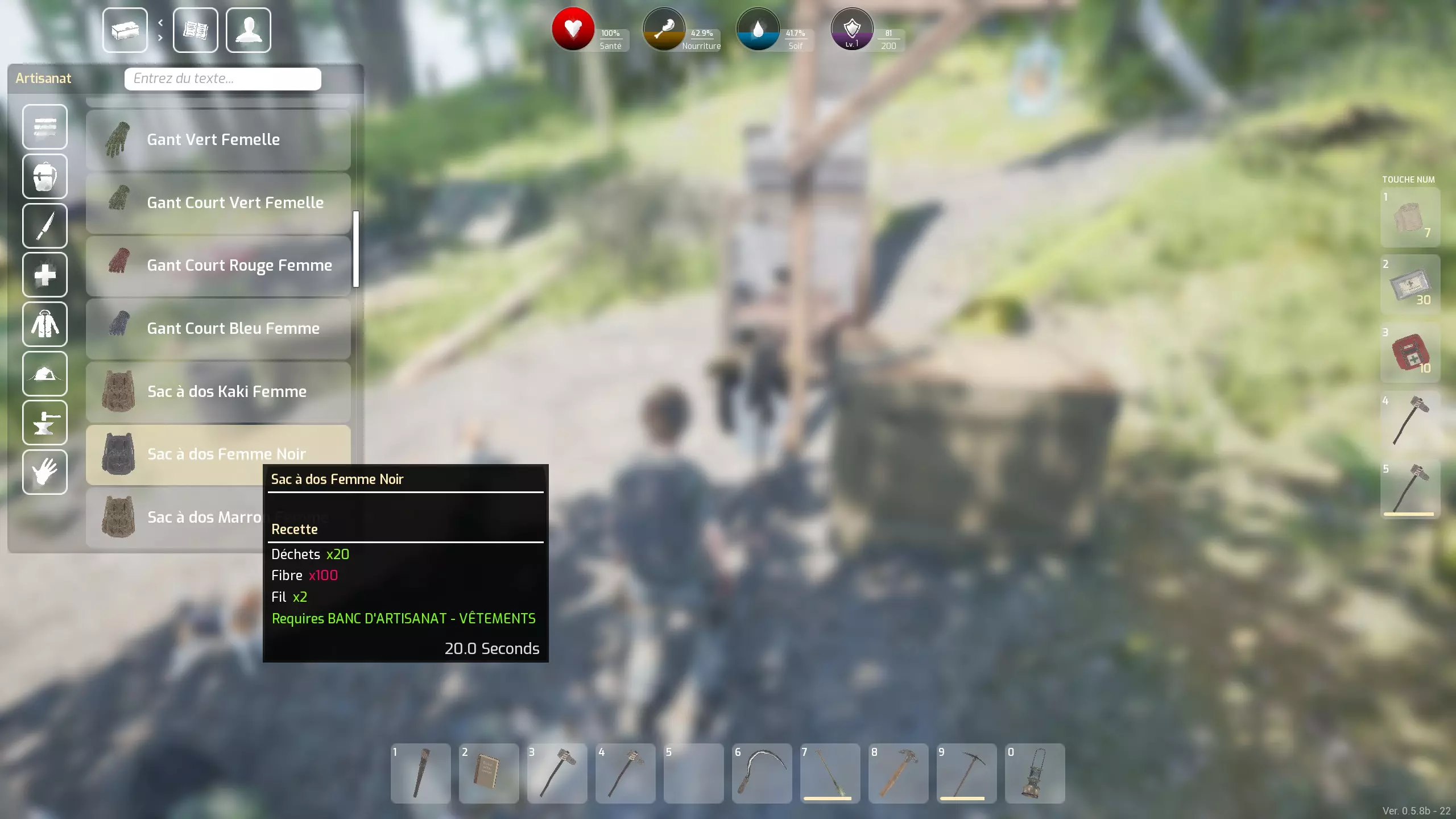 最后说明:右键点击可以将一叠物品对半拆分。 不过接下来,你需要定期查看地图上的【资源点】,为此,你需要通过各种工作台制作工具(主要是挖沙子的铲子和挖金属的镐子),这将是下一章的内容。 关于你的制作:我认为的优先级 我要强调——这是我的个人看法——优先级是扩大你的背包容量,为此你需要一个【衣物工作台】。实际上,虽然其他能增加背包容量的容器很容易找到且数量众多(甚至可以回收它们),但【背包】——所有容器中最重要的——我从未在战利品中找到过:所以你必须自己制作它。