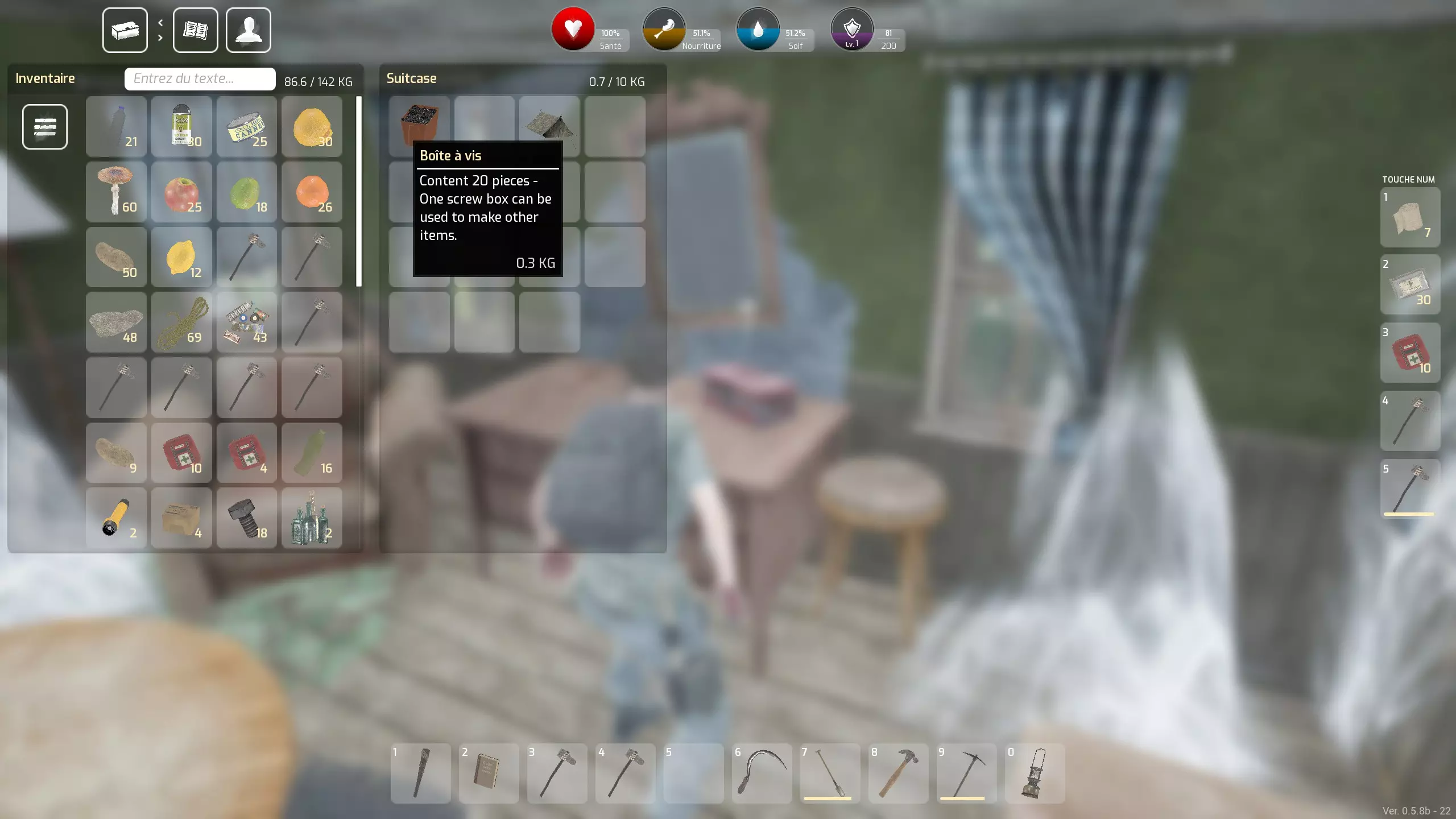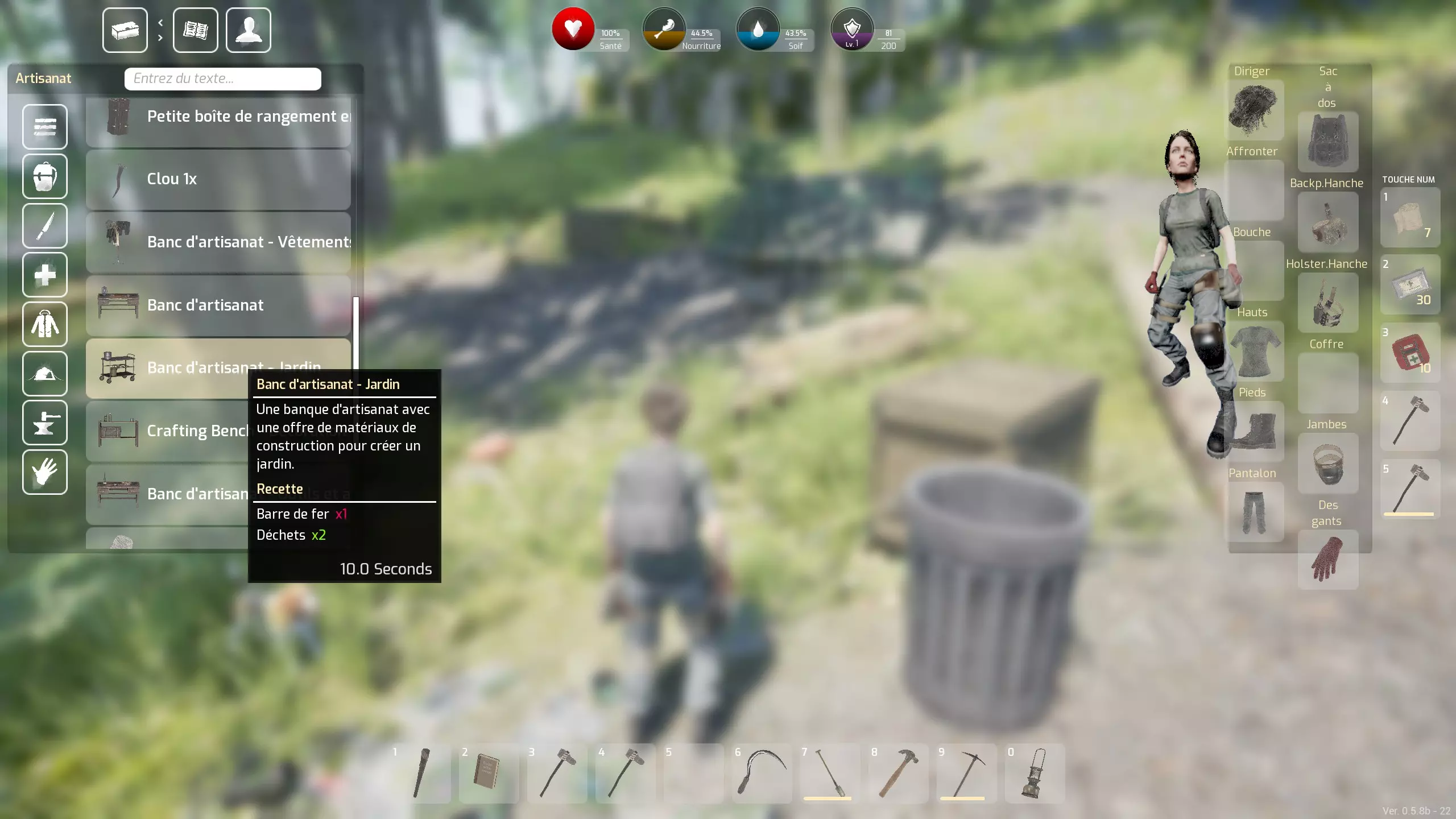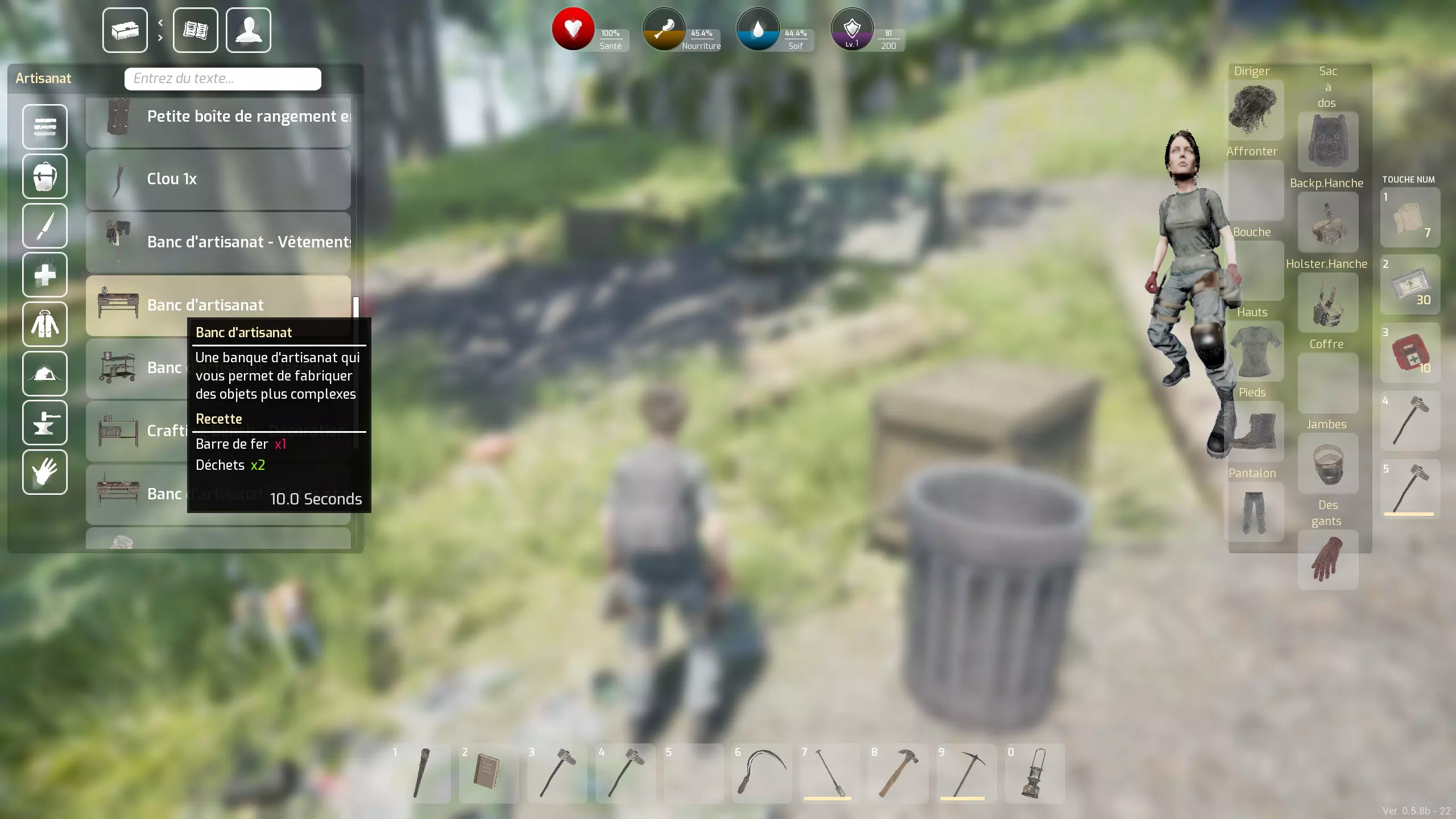 最后说明:右键点击可以将一叠物品对半拆分。 不过接下来,你需要定期查看地图上的【资源点】,为此,你需要通过各种工作台制作工具(主要是挖沙子的铲子和挖金属的镐子),这将是下一章的内容。 关于你的制作:我认为的优先级 我要强调——这是我的个人看法——优先级是扩大你的背包容量,为此你需要一个【衣物工作台】。实际上,虽然其他能增加背包容量的容器很容易找到且数量众多(甚至可以回收它们),但【背包】——所有容器中最重要的——我从未在战利品中找到过:所以你必须自己制作它。