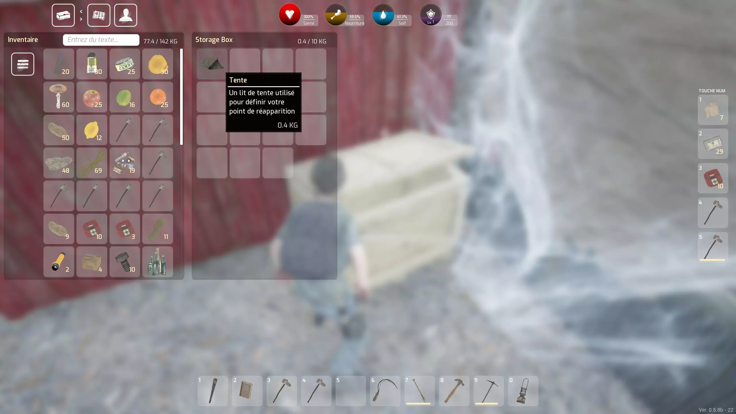 点击图片可放大查看……没错,画面确实有点亮,但我已经在设置中调整了亮度,否则夜晚就什么都看不见了。 请始终确保拥有足够数量的可用斧头……你可以修理它们,但让它们在使用完毕后自行损坏会更简单。 你的第二要务是在营地位置设置一个【重生点】——可以是一个避难所(不推荐,因为它会占用空间,直到你能够将其摧毁),或者更好的选择是一个帐篷,你很容易就能搜刮到(帐篷更美观,但同样也更占空间): 别忘了点击它来激活重生功能!