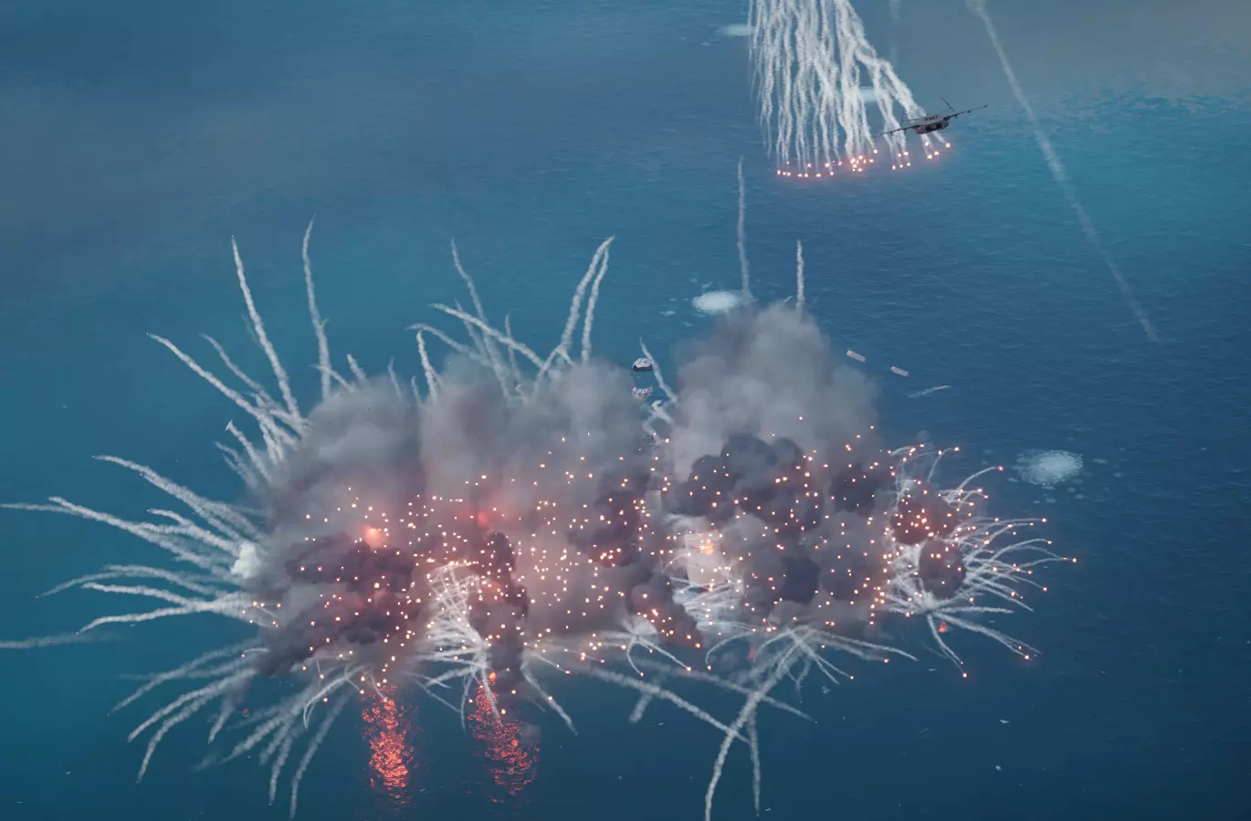 “经典的‘指南针’导弹卡车战术永远不会过时。我会尽可能多地装载AGM-48导弹,低空飞行避开雷达,然后在大约7-8公里的距离从正面接近并齐射。有时候我会被主炮击中受点损伤,但我发现主炮击落导弹的难度比尾部的近防武器系统(CIWS)大得多,所以我通常能命中足够多的次数,彻底炸断舰艏,让‘碎片’号在30秒内沉没。”——AstronoFemboy “在‘指南针’上,我会携带5枚68型导弹和2枚48型导弹。48型导弹在3-4海里处发射以吸引火力,随后发射68型导弹造成主要伤害。”“——ZeroSteve101 “我通常会携带28枚林奇钉和1枚AGM68导弹。当距离碎片5公里以内时,我会先发射AGM68,然后切换到林奇钉并全部发射。如果操作正确,林奇钉应该会比AGM68飞得更快,从而产生屏幕特效,让AGM68对碎片造成巨额伤害。”——JustaRedKia chicane”