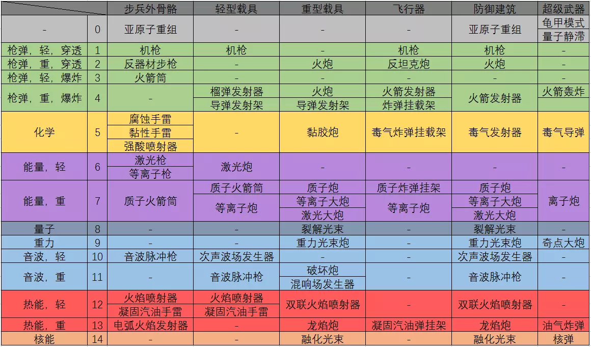 这是游戏《Forged Battalion》的武器对应伤害类型简表,整理了枪弹、化学、能量等多类伤害类型,以及步兵外骨骼、各型载具、飞行器等不同单位对应的武器,清晰呈现武器与伤害类型、适用单位的对应关系。