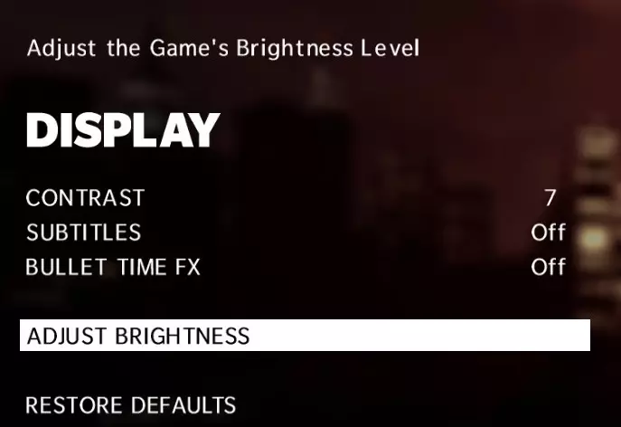 子弹时间特效:关闭 - 因为已经有太多华丽的特效了。 对比度等设置可以随意调整,但我建议调高对比度并降低亮度,以获得更暗的画面效果。