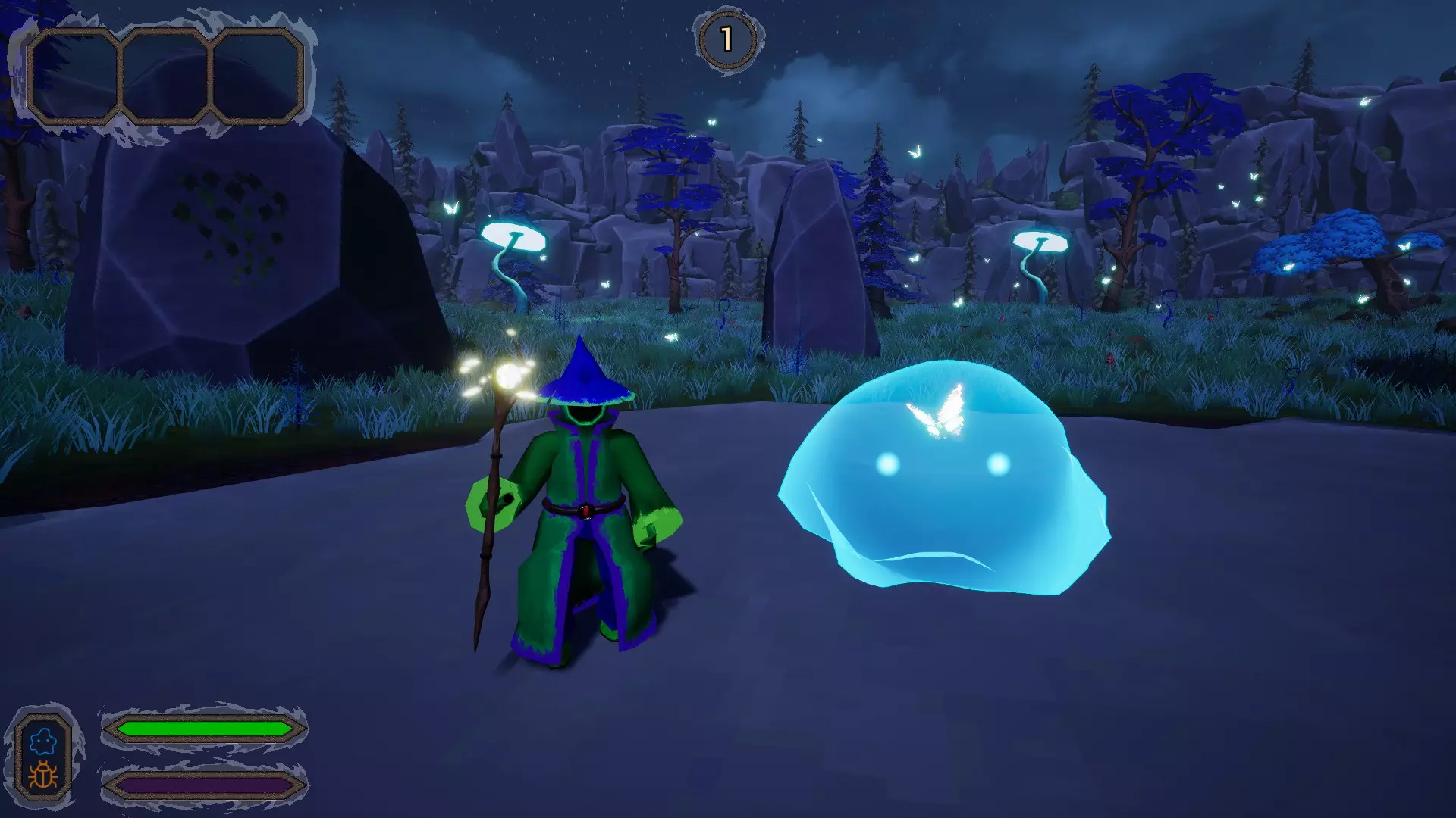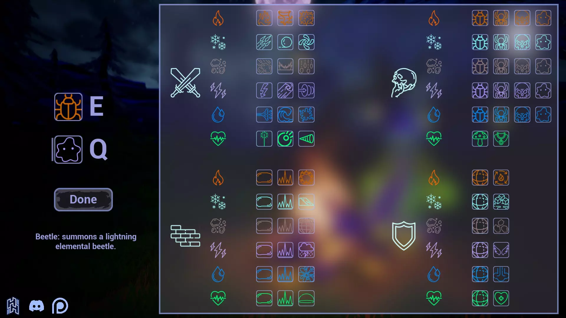 如你所见(在头盔图标下方是召唤技能,如果你实在找不到的话),我们有以下元素: - 火焰 - 冰冻 - 大地 - 闪电 - 水 此外还有治疗系,但这部分我稍后再解释。上述所有元素各有4个技能,它们之间没有太大区别: - 召唤史莱姆(远程) - 甲虫(空中攻击) - 蜘蛛(近战,大概就是扑上去咬一口之类的) - 小骷髅(也是近战,但不会扑上去咬了) 你可以在下方看到它们。