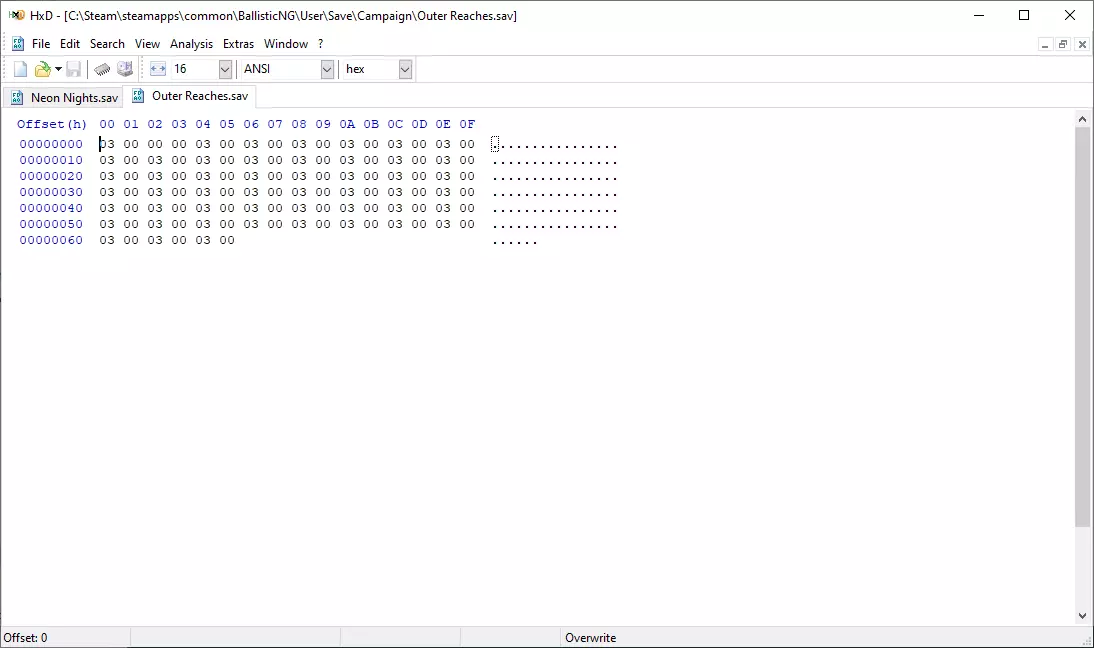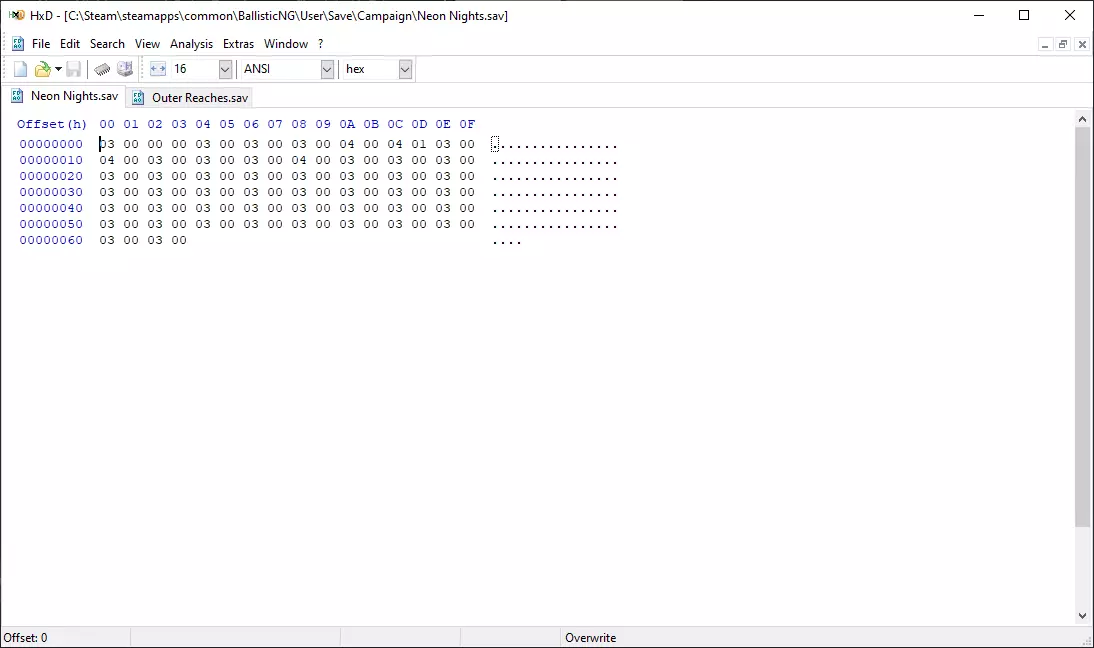 现在你需要做的是将Neon Nights.sav和Outer Reaches.sav文件拖入HxD中打开。之后你会看到类似这样的内容:
