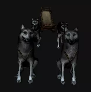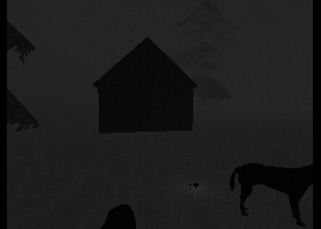 如果说的是小屋正前方,那里坐着一只叼着蘑菇的小狗!