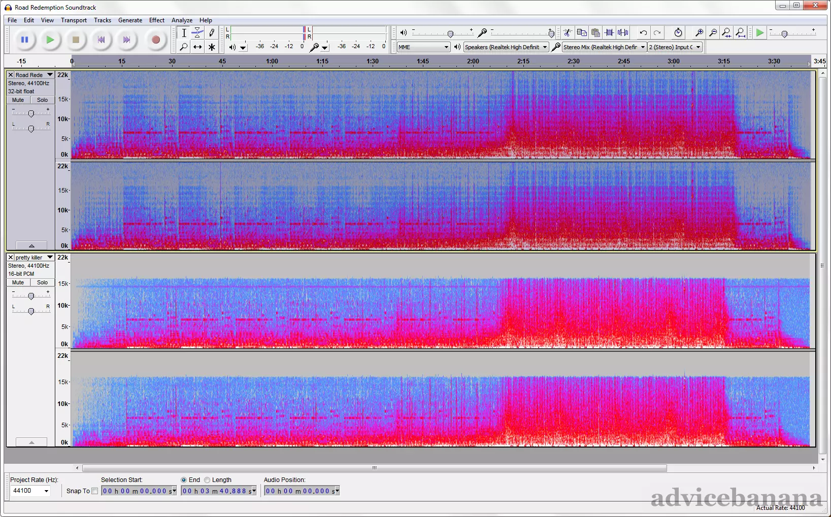 《Road Redemption》万圣节更新内容 2014年10月30日,游戏新增了几首音轨。同时,请从resources.assets中提取以下文件: AlScare.ogg Devils_Chorus.ogg FearTwentyPercent.ogg ghostTechnoDream.ogg labry.ogg Scary.ogg 技术方面及限制 编码格式 从游戏资源中提取的音乐采用OGG Vorbis编码格式,比特率约为120kbit/s。 你的手机可能不支持此格式。建议使用foobar2000将文件转换为mp3格式(推荐格式:lame,MP3 VBR,V5)。可能还有其他相关指南可供参考。 尽管这些文件的质量尚可,但远非完美。我曾使用Audacity查看其中一首音轨的频谱图,其低质量特征较为明显。大约16千赫兹的截止频率意味着其音质类似于128千比特的MP3,这种音质接近网络广播流,但达不到高保真音频录制的水准。此截图对比了由“HD Mixes”在视频平台发布的《公路救赎》菜单音乐高清混音版(上方)与我们刚提取的音轨(下方)。
