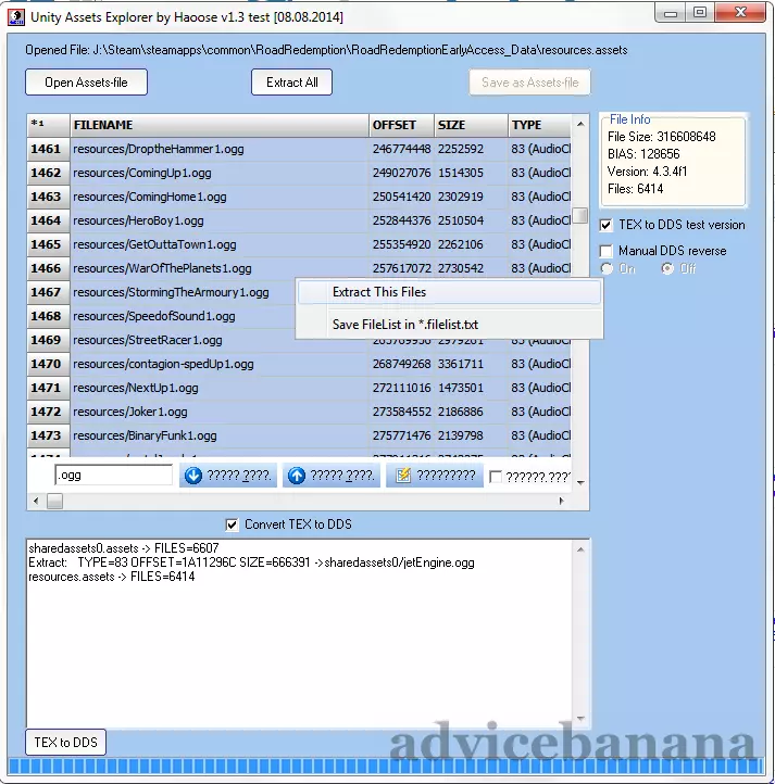 在列表下方的搜索栏中输入“.ogg”,即可找到众多文件中的音乐文件。第一个文件是#1461,路径为resources/DroptheHammer1.ogg。稍微滚动页面并使用【Shift】+【点击】,可以选中DroptheHammer1.ogg正下方所有扩展名为ogg的文件。选中所有文件后,在高亮文件上右键点击,从上下文菜单中选择“Extract This Files”(英文表述有误)。