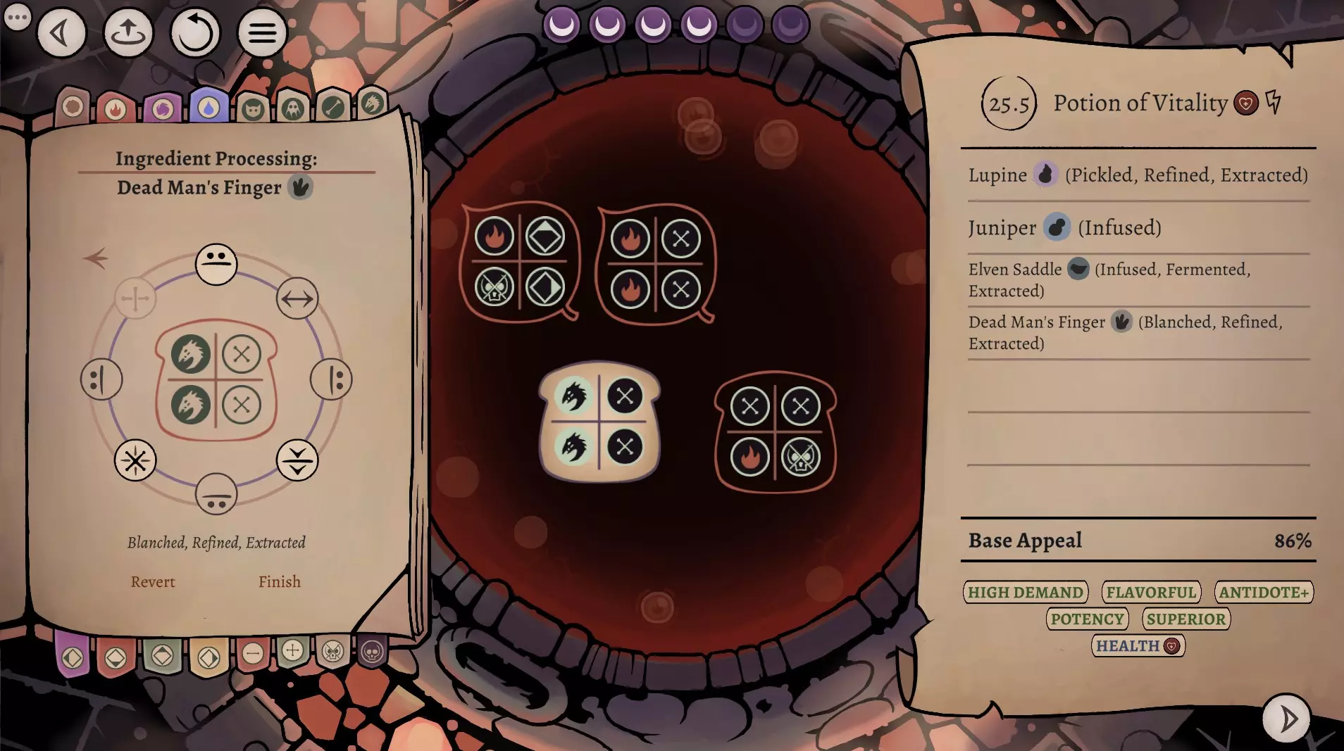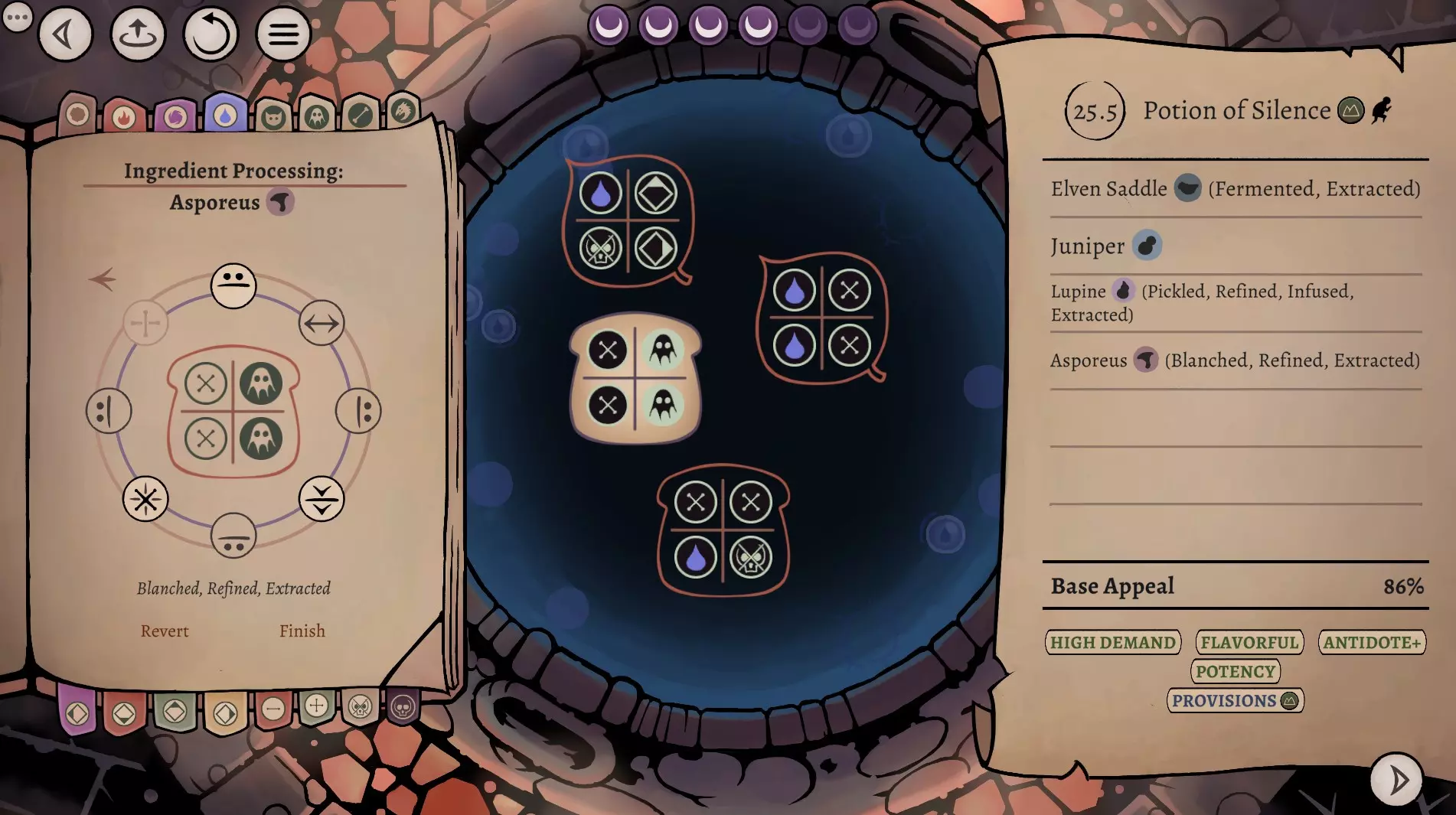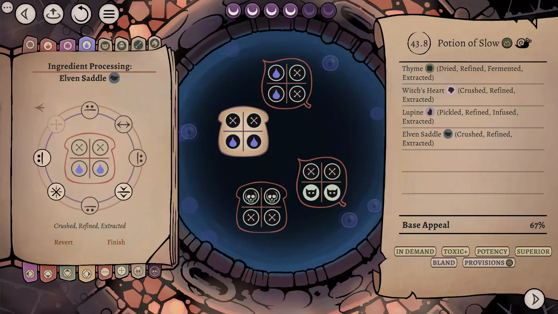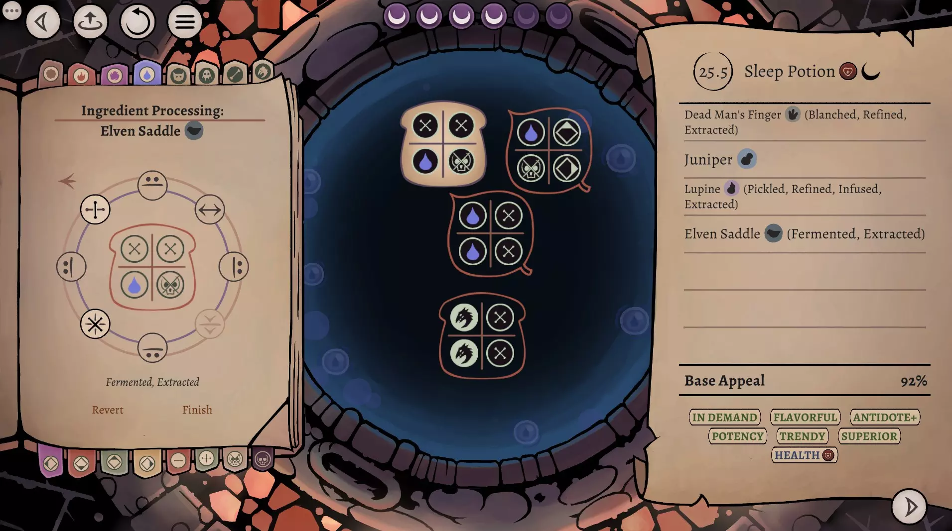 这是《药剂大亨》正式版大师难度的终局药剂配方指南,分享了通关用的16种终极药剂配方,包含后期生命、法术、配置等药剂,所有药剂使用相同瓶盖、瓶子和小饰品来优化利润,还展示了炼金界面及各药剂的原料处理、配方详情。