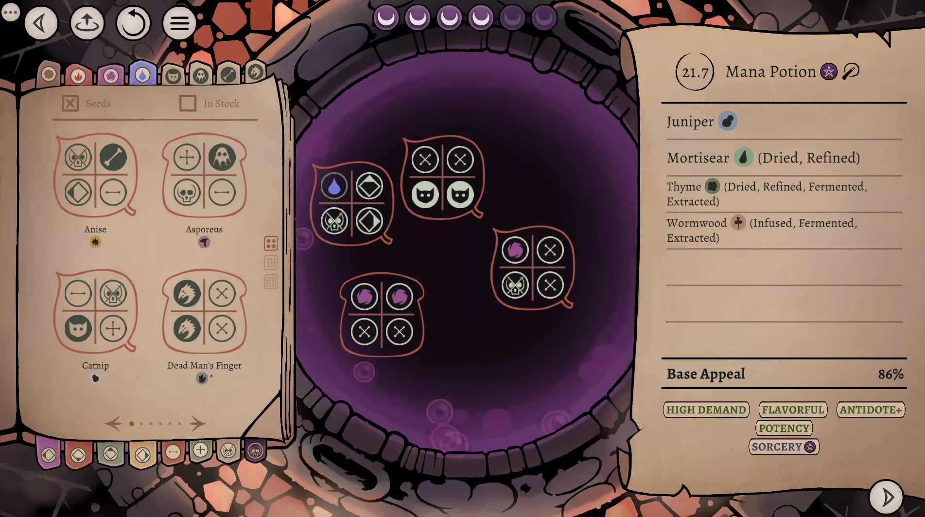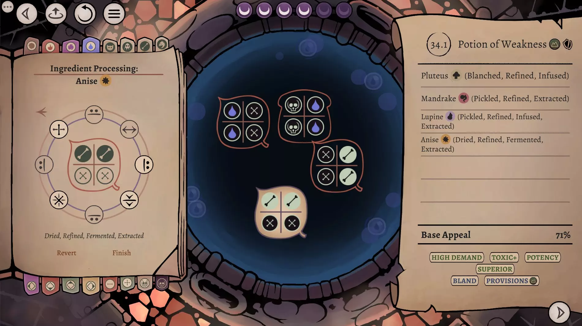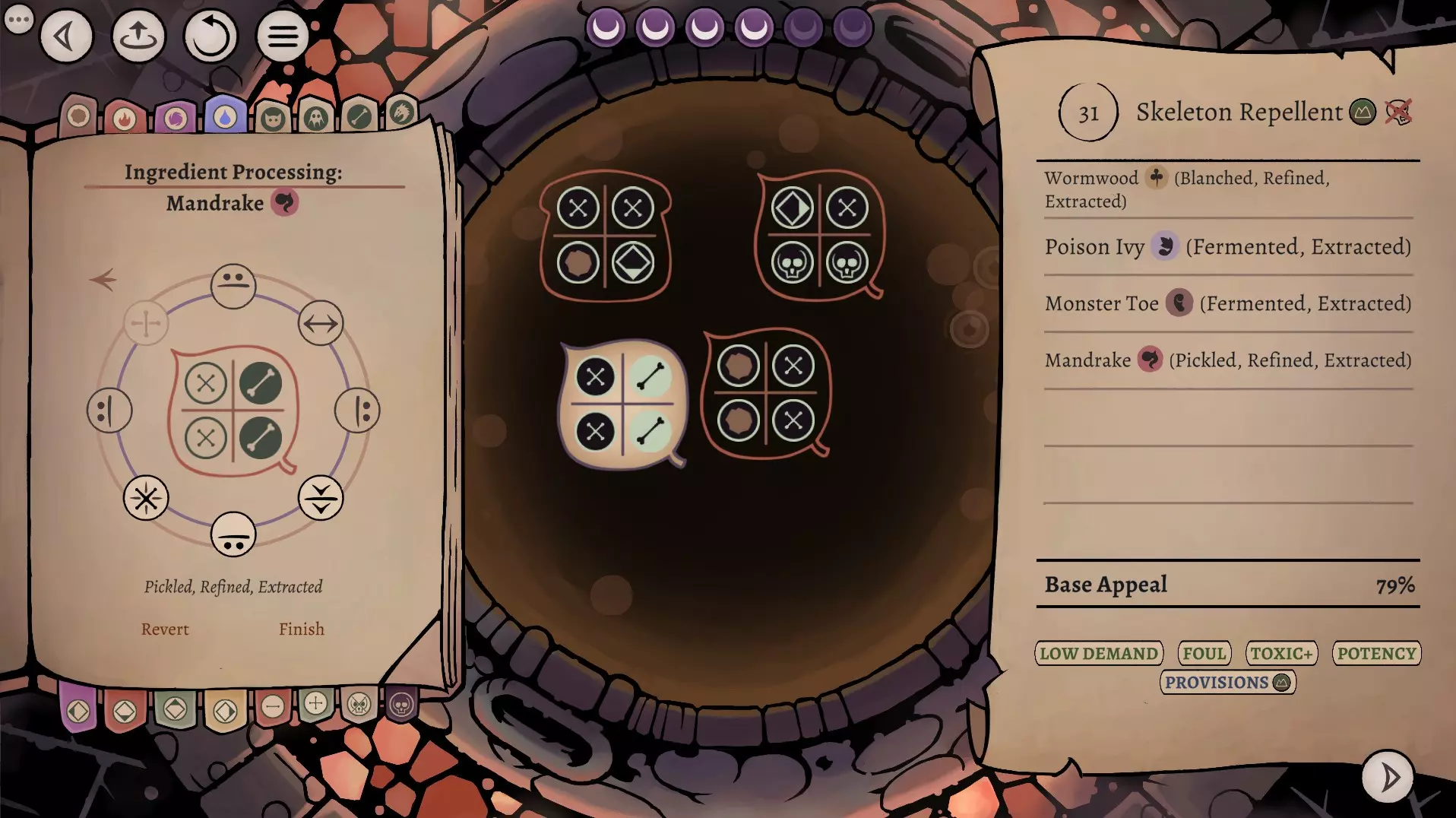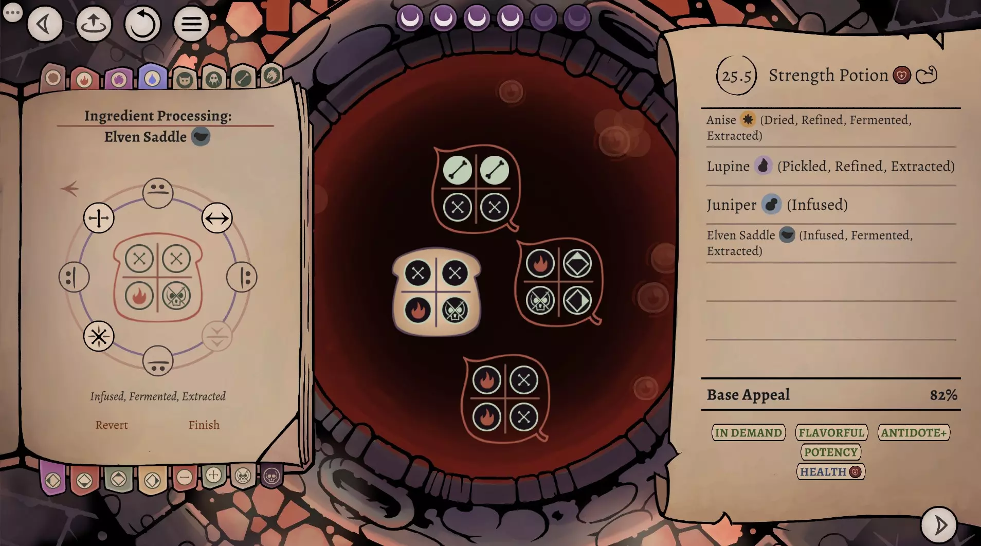 这是《药剂大亨》正式版大师难度的终局药剂配方指南,分享了通关用的16种终极药剂配方,包含后期生命、法术、配置等药剂,所有药剂使用相同瓶盖、瓶子和小饰品来优化利润,还展示了炼金界面及各药剂的原料处理、配方详情。