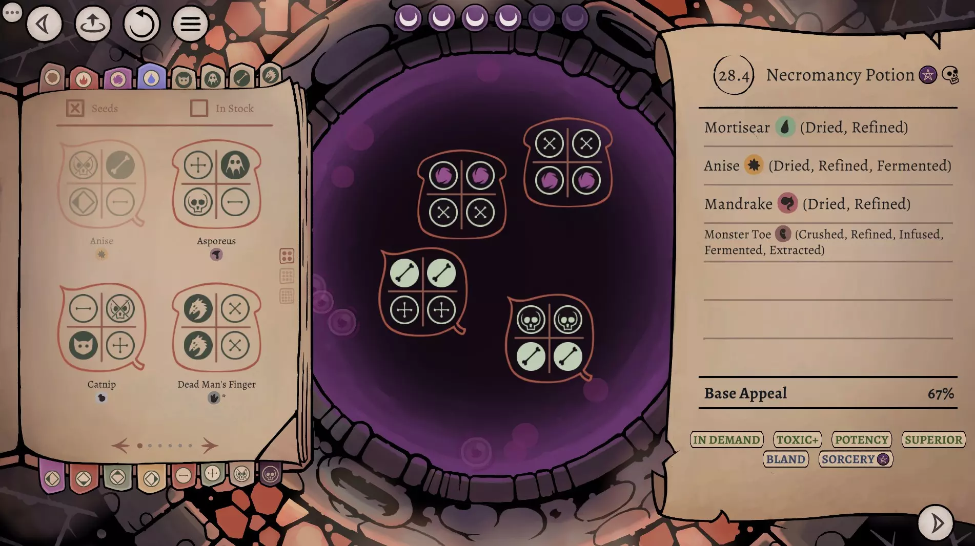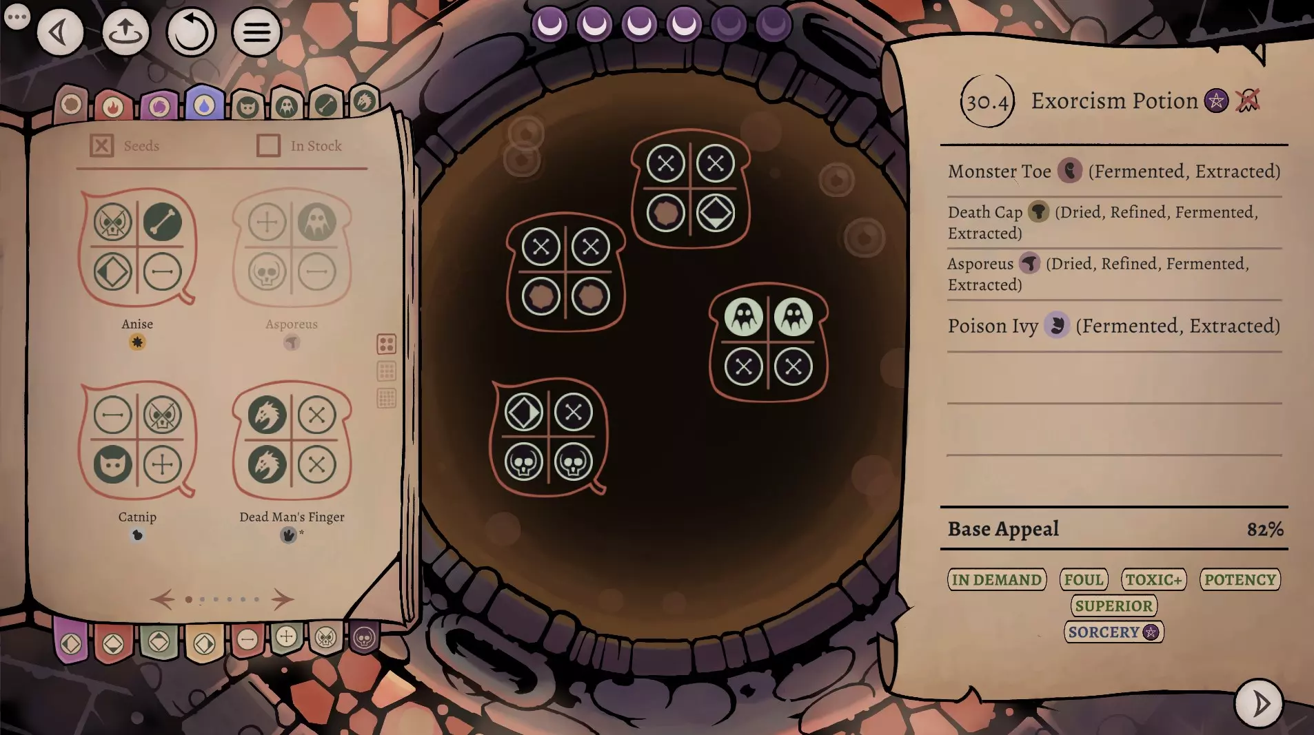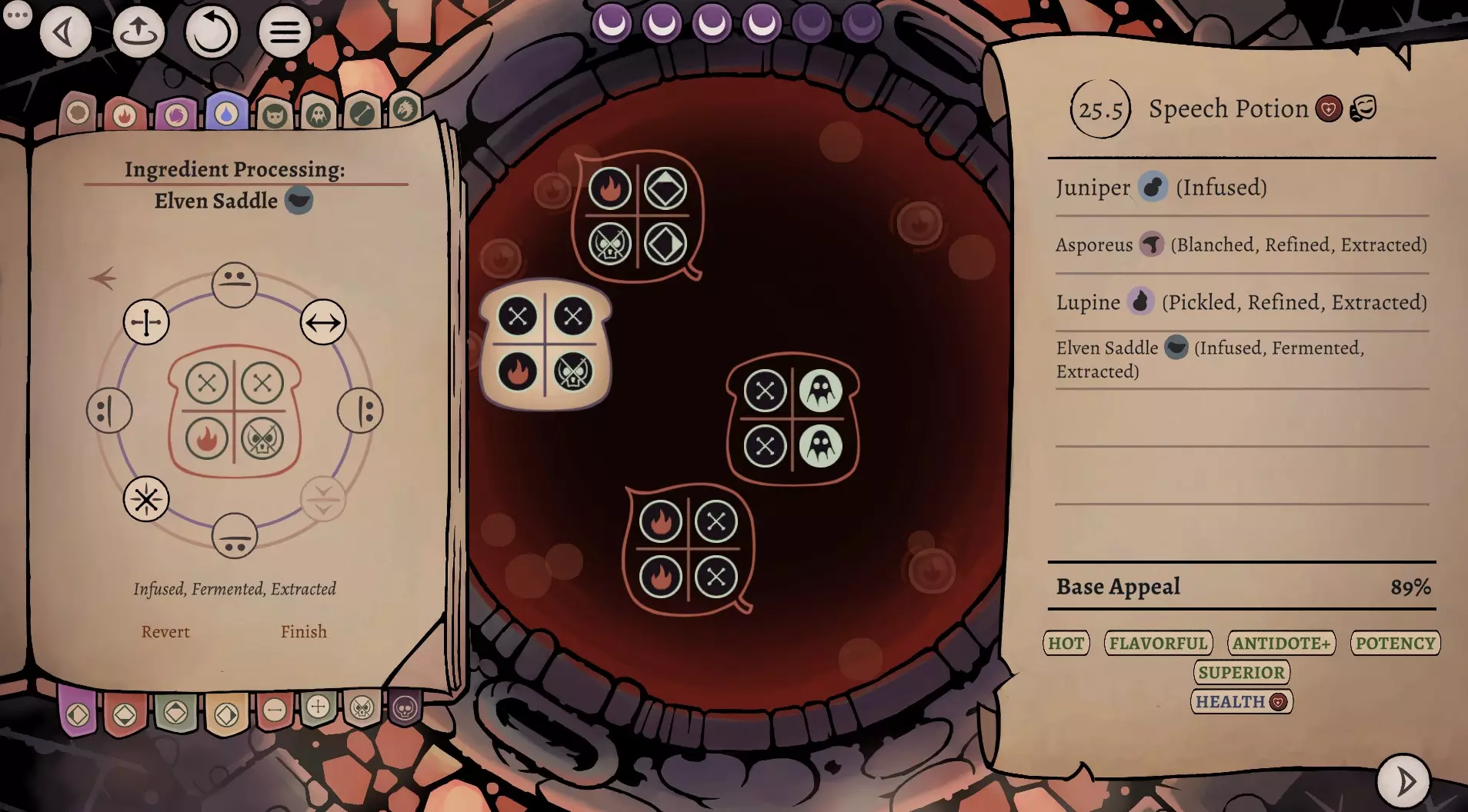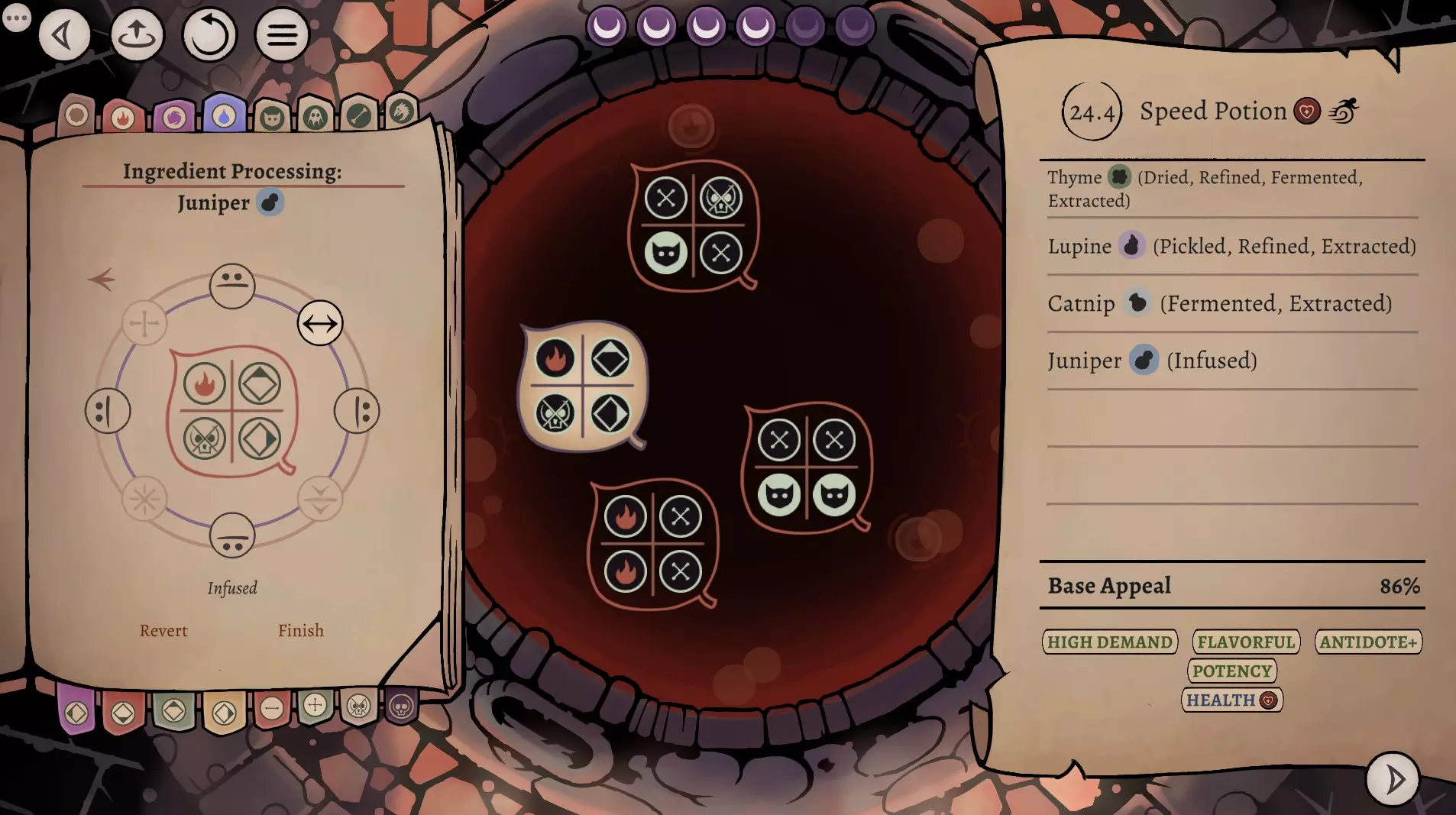 这是《药剂大亨》正式版大师难度的终局药剂配方指南,分享了通关用的16种终极药剂配方,包含后期生命、法术、配置等药剂,所有药剂使用相同瓶盖、瓶子和小饰品来优化利润,还展示了炼金界面及各药剂的原料处理、配方详情。